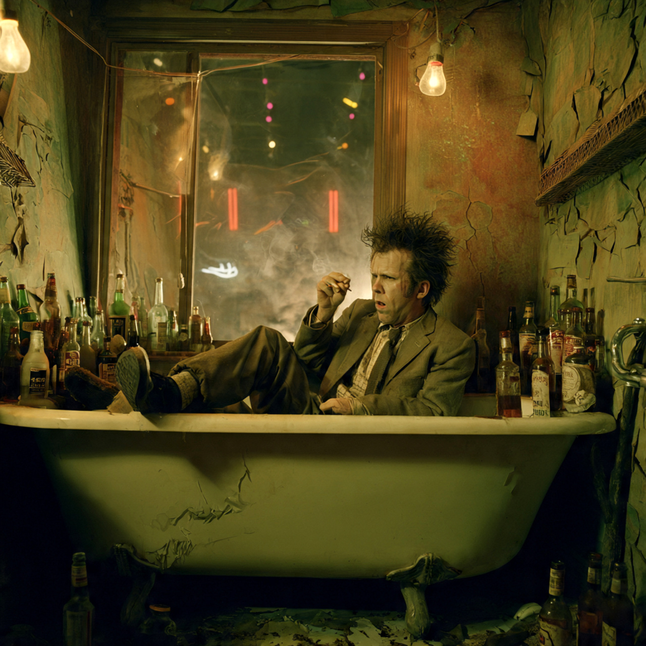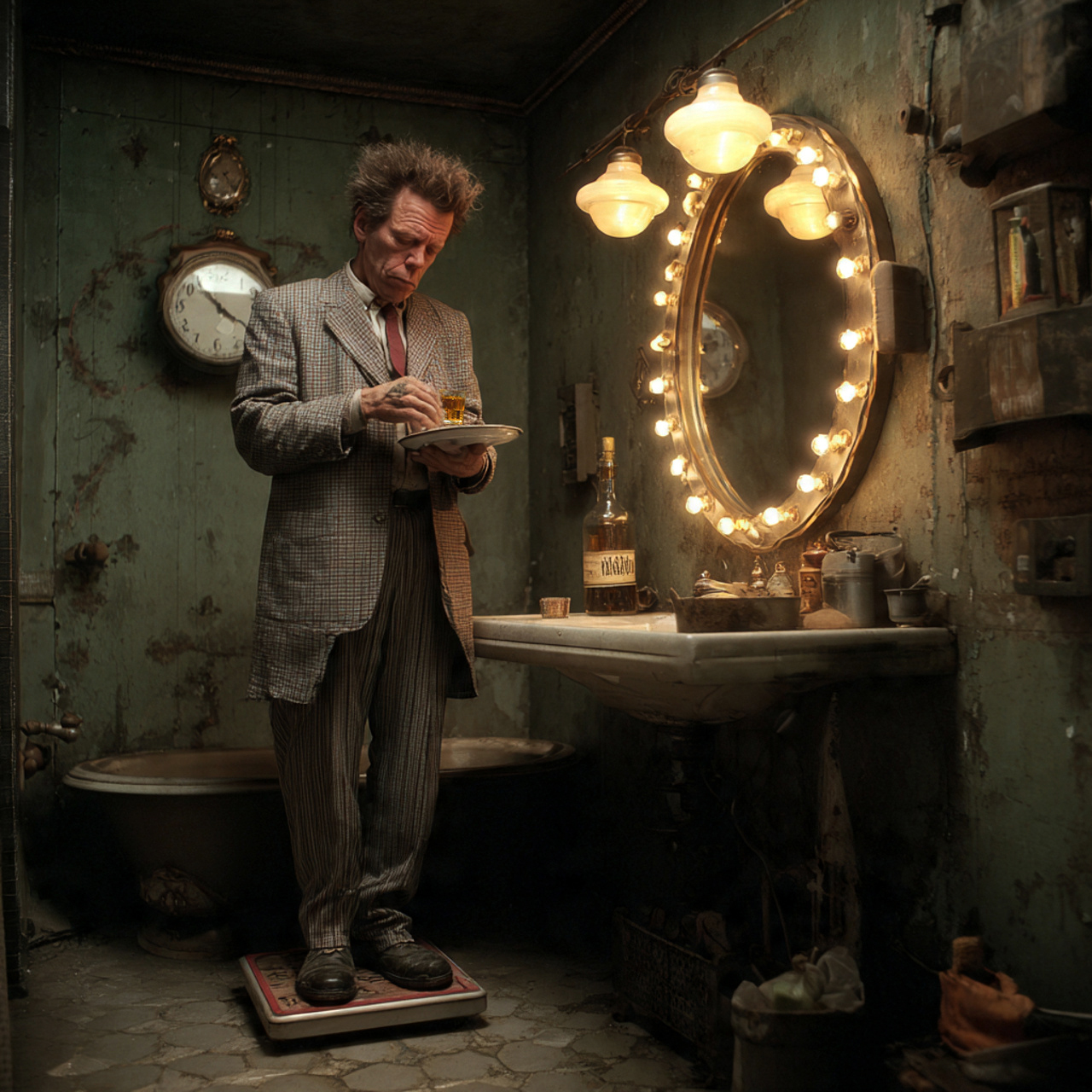 Vintage, piano-driven song with a gritty, deep, gravelly, whiskey-soaked male vocal with a raspy, growling delivery, Slightly slurred, bluesy phrasing with dramatic storytelling emphasis, Slow, smoky, late-night diner atmosphere with upright piano leading the melody, brushed jazz drums, upright bass, muted trumpet accents, and raw folk-blues guitar textures, The sound is loose, ramshackle, and soulful, blending elements of folk storytelling, jazz cabaret, and bluesy grit, like a 1970s dive bar performance, Catchy, memorable