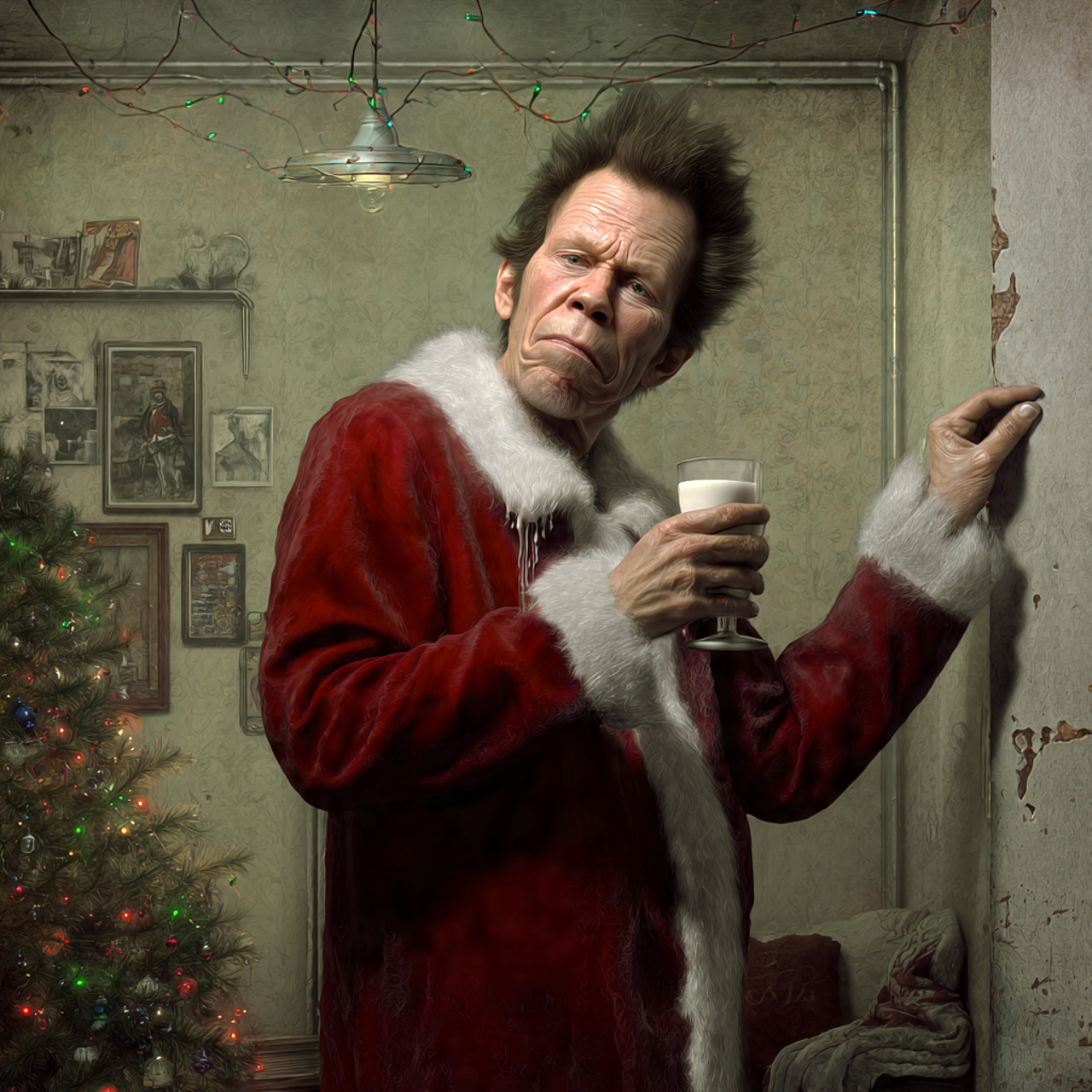 Vintage, piano-driven blues-cabaret Christmas song with a gritty, deep, whiskey-soaked male vocal featuring a raspy, gravelly, growling delivery, Slightly slurred, bluesy phrasing with dramatic storytelling emphasis, like a worn-out troubadour mumbling in a smoke-filled booth, The atmosphere is slow, smoky, & cinematic, evoking a midnight diner or dimly lit dive bar, Upright piano drives the melody with loose, stumbling charm, supported by angular guitar with cuban-inspired dissonant jazzy tinged blues-inspired licks, brushed jazz drums, upright bass, muted trumpet lines, creaking bar-room percussion, & raw, slightly detuned folk-blues guitar textures, For holiday texture, gently weave in triangle hits, sleigh bells, jingle percussion, & faint, off-kilter Christmas chime embellishments, The sound should feel ragged, soulful, & unpolished—ramshackle but intentional—blending folk noir, jazz Christmas, cabaret, blues grit, & dusty 1970s barroom energy, The mix is warm, analog, & intimate