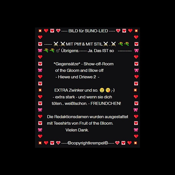 Funk the tank, Female Rap, Polyphone singing Female vocals only but supercool and funky as hell und bissi dunkel von mir aus auch, Klaro mit Kater Carlos auf Aalsterwasser