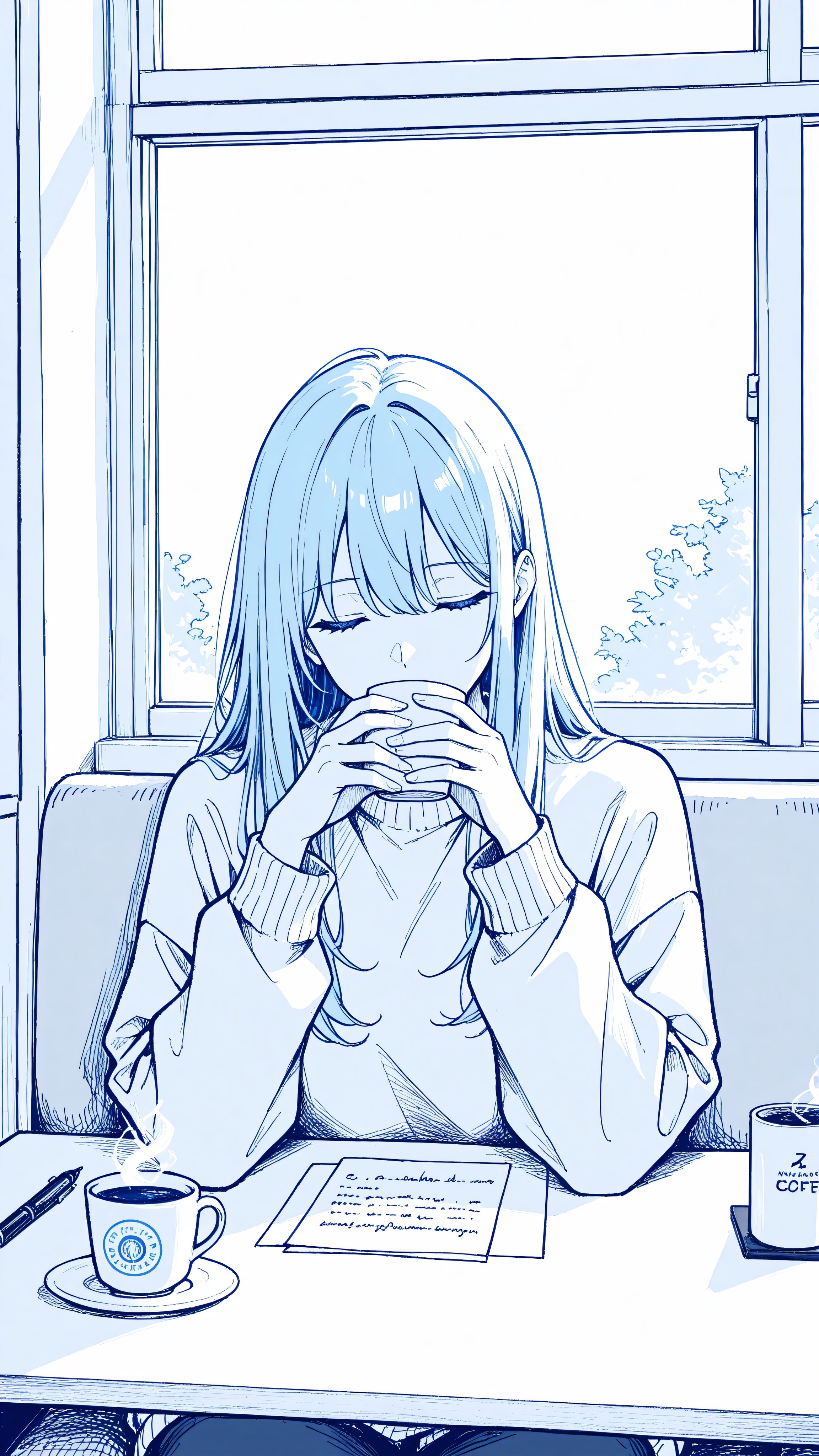 [Lyrics]: Restful morning, café vibes, coffee, watching time pass, subtle loneliness
