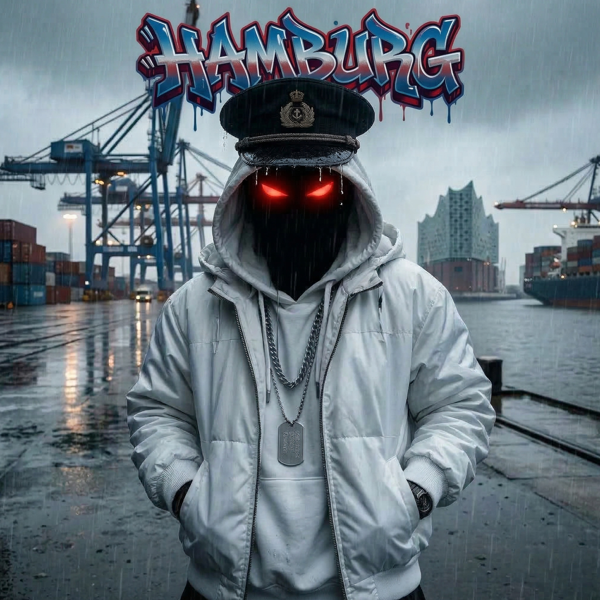 A gritty 90s boom bap hip-hop track inspired by Hamburg rap and Hamburger Schule aesthetics, Crunchy sampled drum breaks, warm vinyl textures, jazzy piano loops, and deep upright bass create a raw underground groove, German rap vocals deliver laid-back yet sharp flows, evoking urban harbor atmosphere, street poetry, and nostalgic city nightlife energy