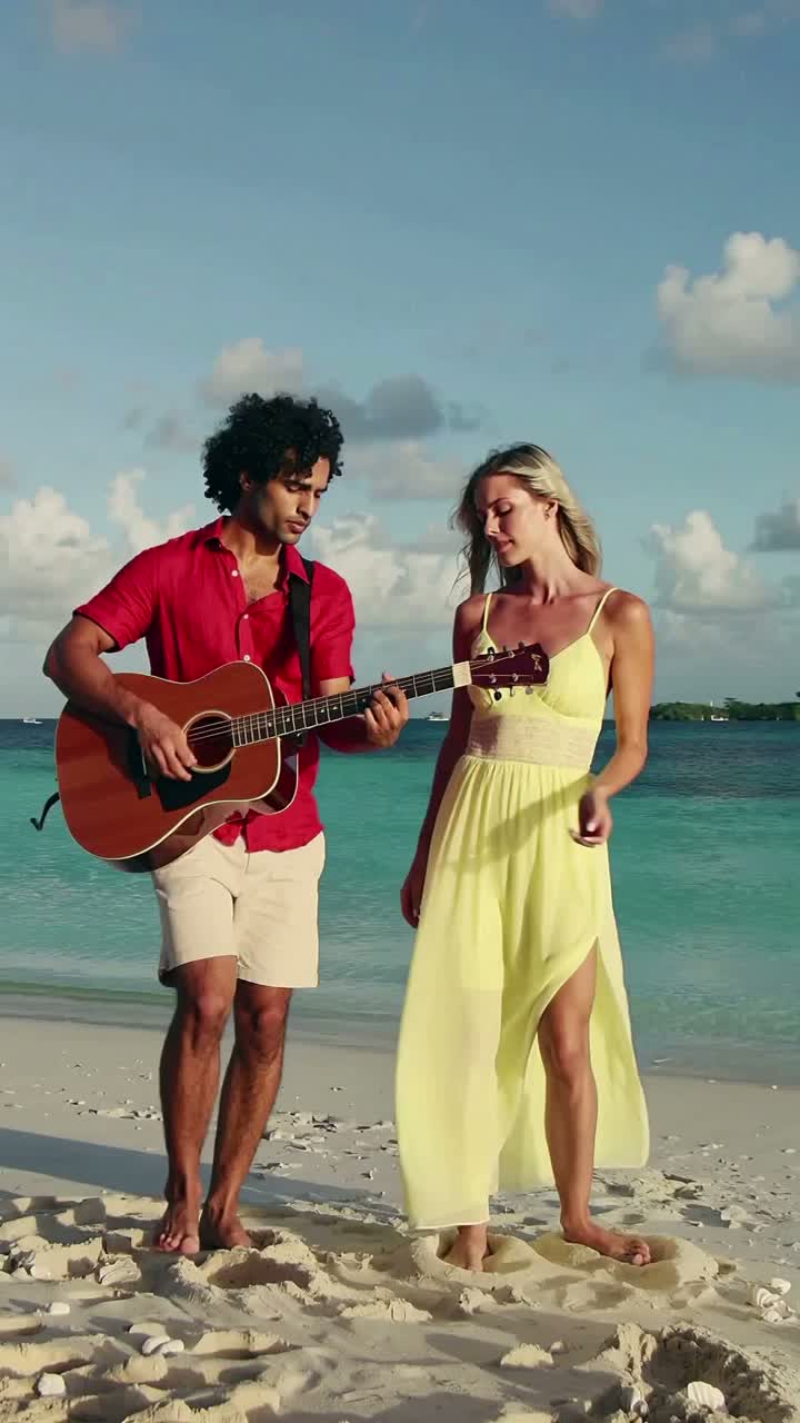 Upbeat Latin Pop, Reggaeton influences, acoustic guitar, sunny beach vibe, energetic, feel-good, tropical rhythm, summer anthem, male and female vocals