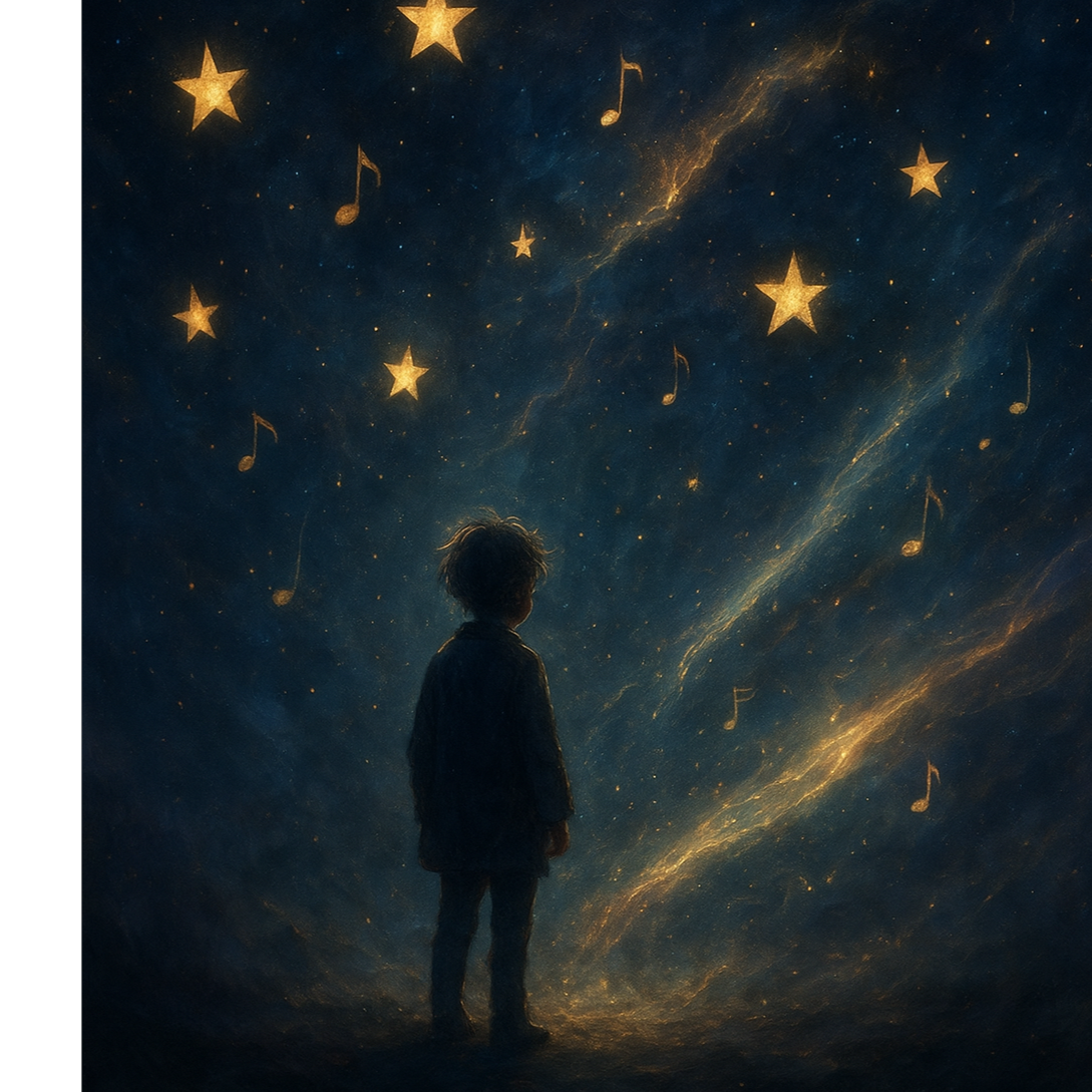 Melancholic indie ballad scene, female soprano singing under soft stage lights, emotional expression, soft electric guitar arpeggios, dreamy night sky with glowing paper stars, intimate and cinematic, moody colors, gentle reverb atmosphere
