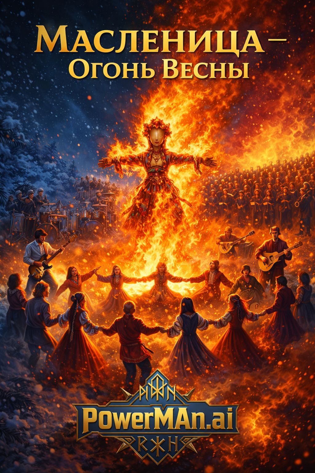Symphonic Rock Drum-n-Bass Opera with strong Russian Folk influence about Maslenitsa, Joyful, energetic, epic, Tempo 172 BPM for DnB drop, orchestral intro 130 BPM, Instruments: full symphonic orchestra (strings, brass, timpani), distorted electric guitars, powerful rock drums, fast drum-n-bass breakbeats with deep sub bass, large mixed choir, Strong Russian folk elements: gusli arpeggios, balalaika riffs, svirel flute, buben percussion, wooden spoons rhythm, festive folk dance energy, Structure: folk intro → rock verse with balalaika → choir build → epic operatic chorus → massive DnB drop with chopped folk instruments → fast vocal verse → grand final chorus combining orchestra, DnB and full folk ensemble, Mood: festive, bright, triumphant, burning winter effigy, welcoming spring, Clean powerful vocals, dynamic contrast, cinematic mix, massive bass impact, authentic Slavic folk atmosphere
