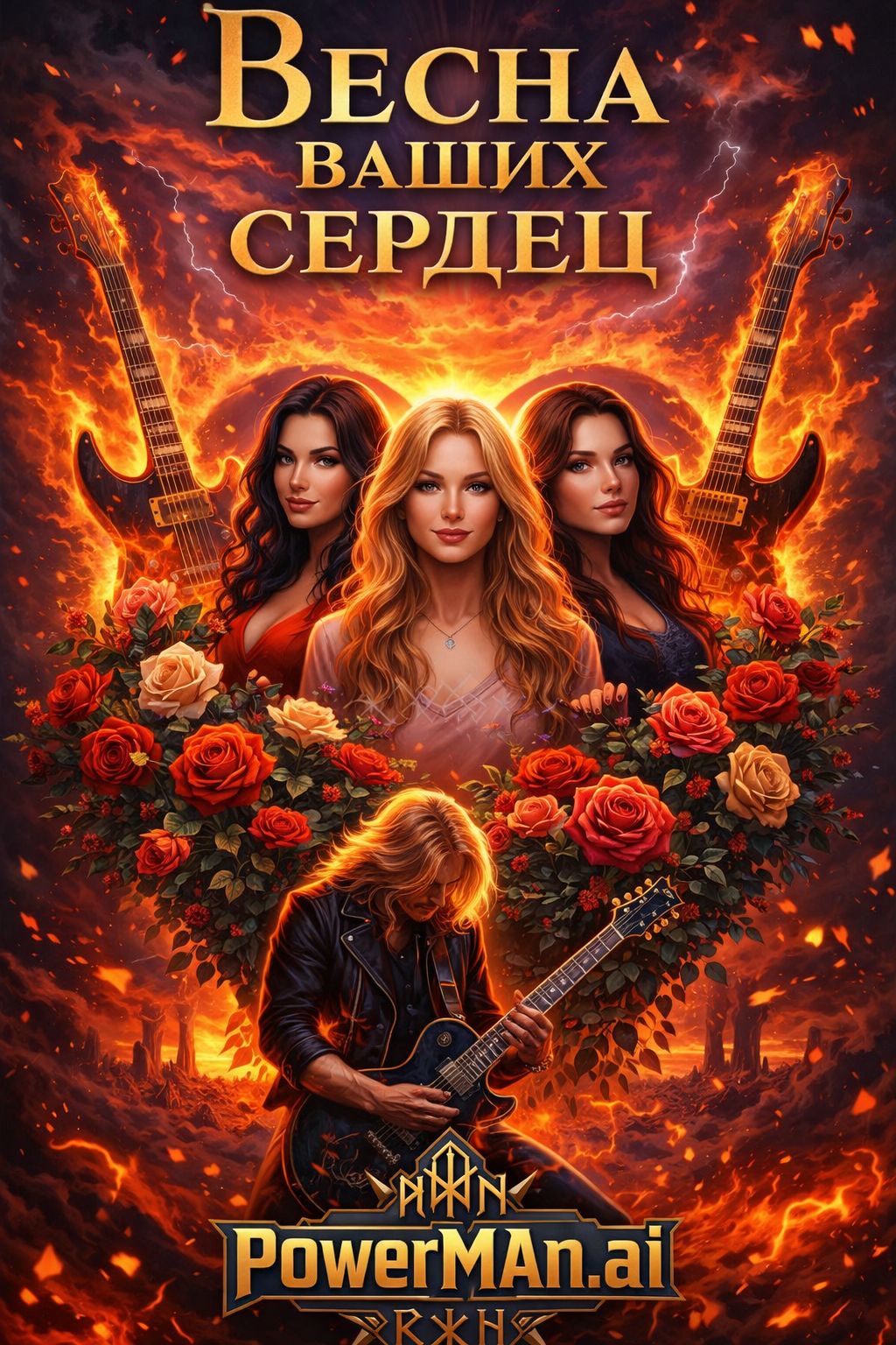 Hard rock power ballad about International Women's Day, Strong emotional male rock vocal, Style: classic hard rock ballad with powerful chorus, Intro with clean electric guitar arpeggios and piano, slowly building tension, Instruments: electric guitars with big distortion, melodic lead guitar solos, acoustic guitar layers, bass guitar, powerful rock drums, piano, orchestral pads and strings, Anthemic hard rock chorus with strong drums and wide guitars, After second chorus long expressive guitar solo with bends, sustain and melodic phrasing, Tempo moderate, Mood: epic, romantic, celebratory, Theme: admiration and gratitude for women — mothers, wives, daughters, sisters, Spring atmosphere, flowers, warmth and love, Big cinematic ending with layered vocals and soaring guitar
