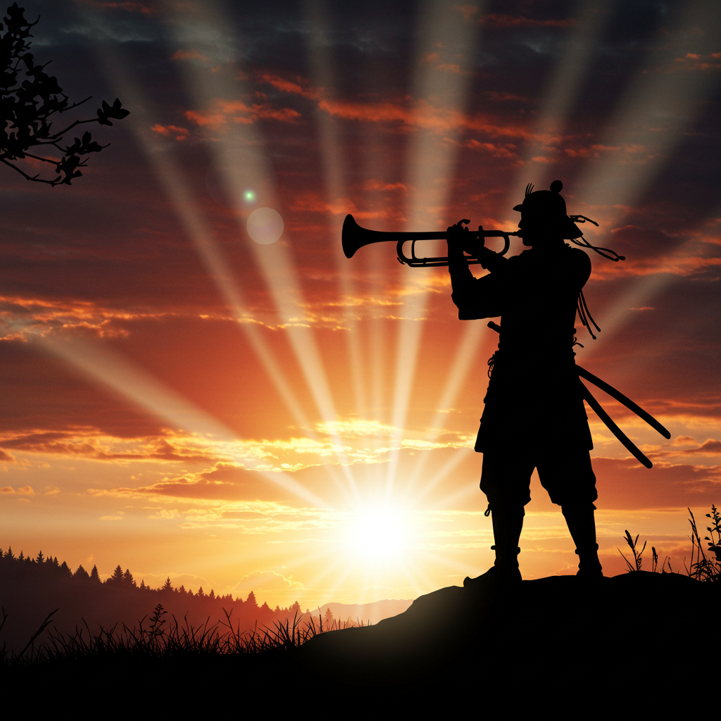 60s–70s cinema music, solo trumpet with acoustic orchestra; singable main theme played by trumpet, layered with string and woodwind counter-melodies; variation sections where strings lead; melancholic sub-theme in trumpet; bridge with heroic percussion rhythm and bold brass; outro led by flute holding Theme B motif with soft strings; moderate tempo, elegant and brave with subtle Japanese aesthetics; slight analog warmth and wide stereo separation, ‑vocal, ‑electrical instruments