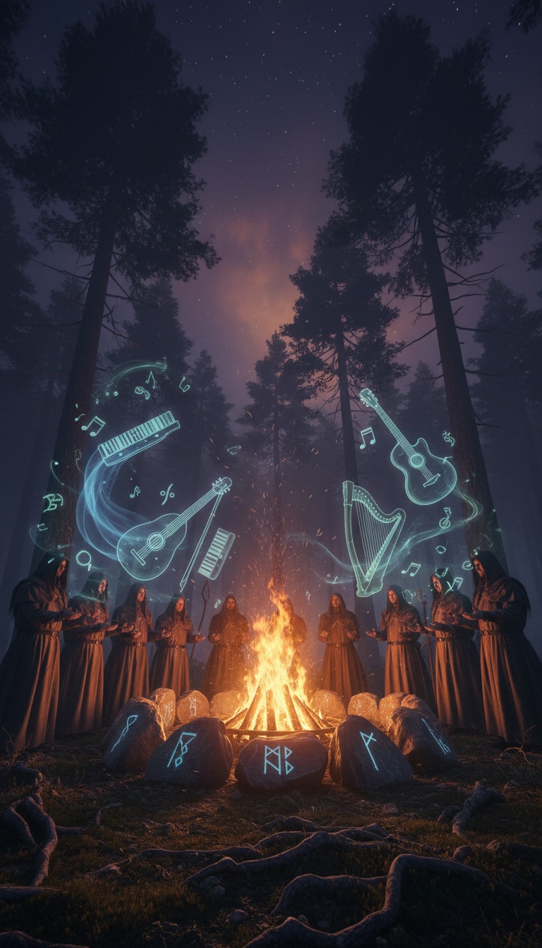 Dark Nordic folk inspired by Scandinavian folklore, Minor key melody, Traditional fiddle lead complemented by Nyckelharpa, violin, viola, acoustic guitar and harp, Subtle keyboards, synthesizer pads and horns create a haunting soundscape, Mysterious, ancient, slightly sinister mood, Sounds like a lost Nordic legend told through music, Calm, ambient mode
