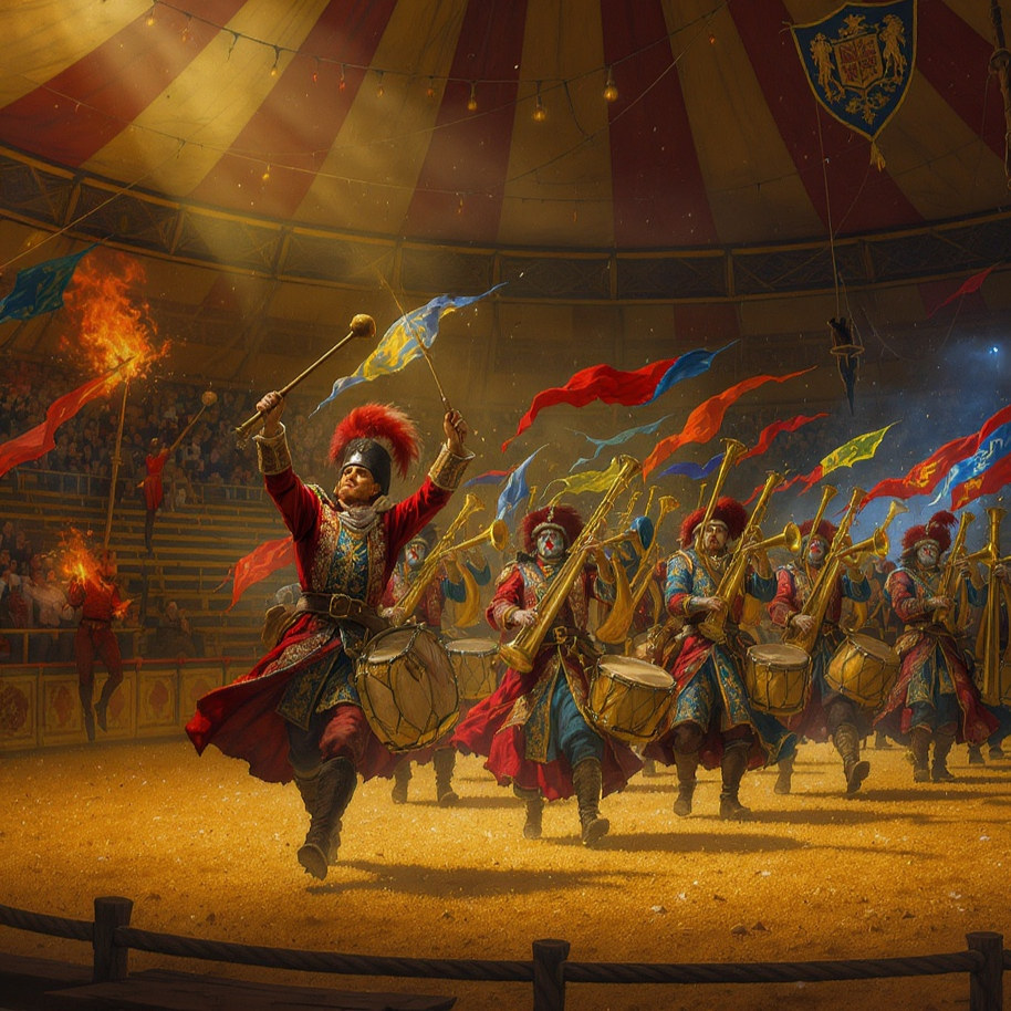 heavy brass, haunting woodwinds, german marching band, instrumental, marching band, steady percussion, dark and ominous