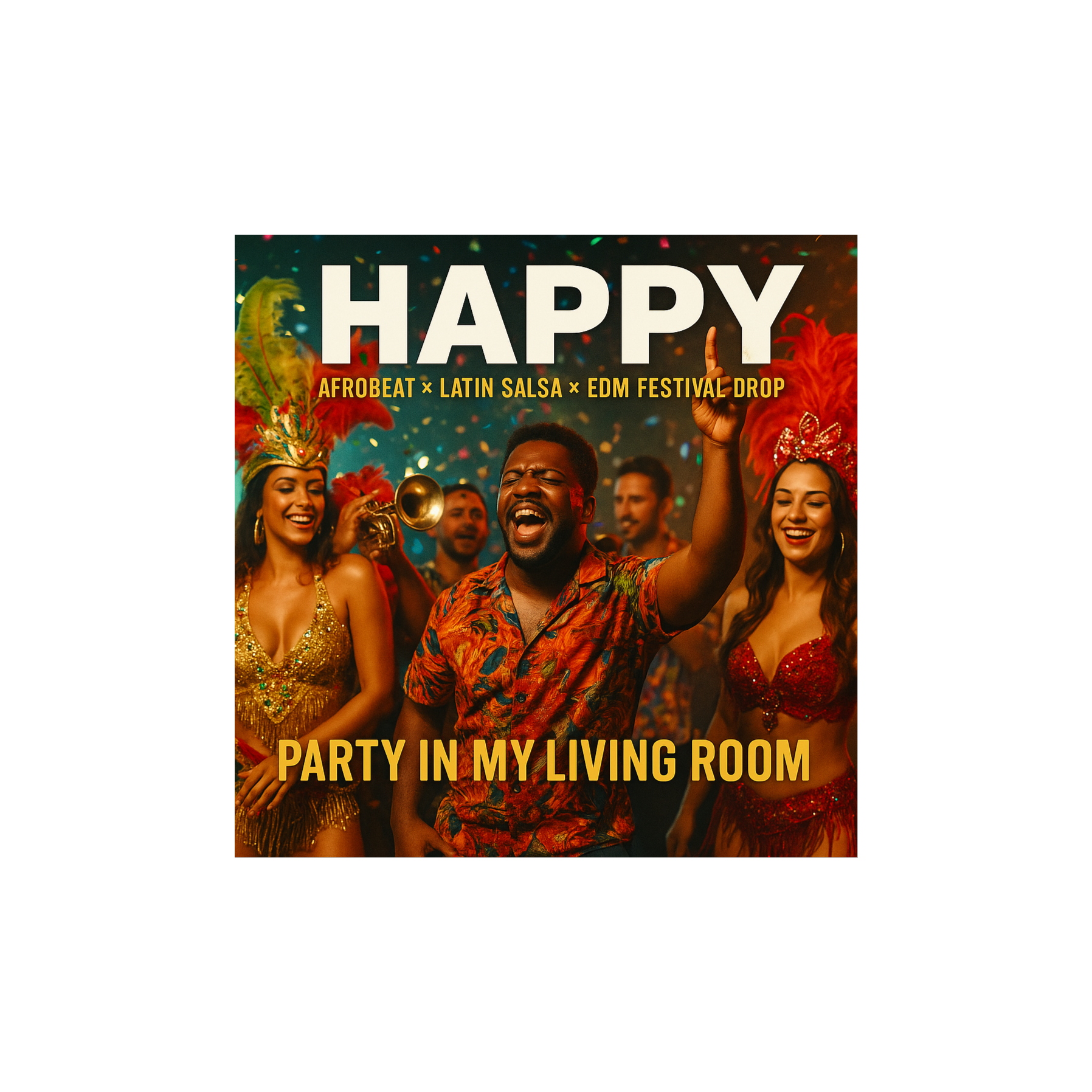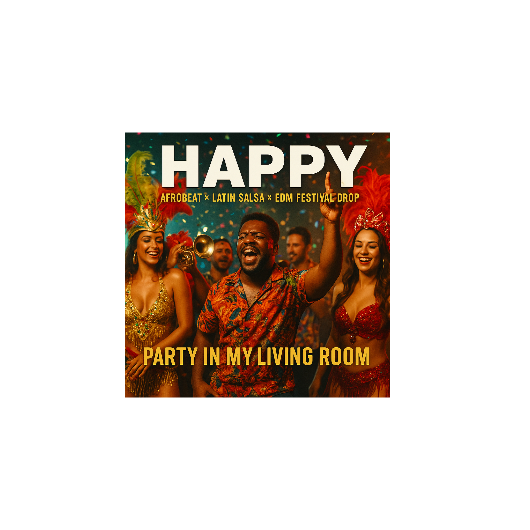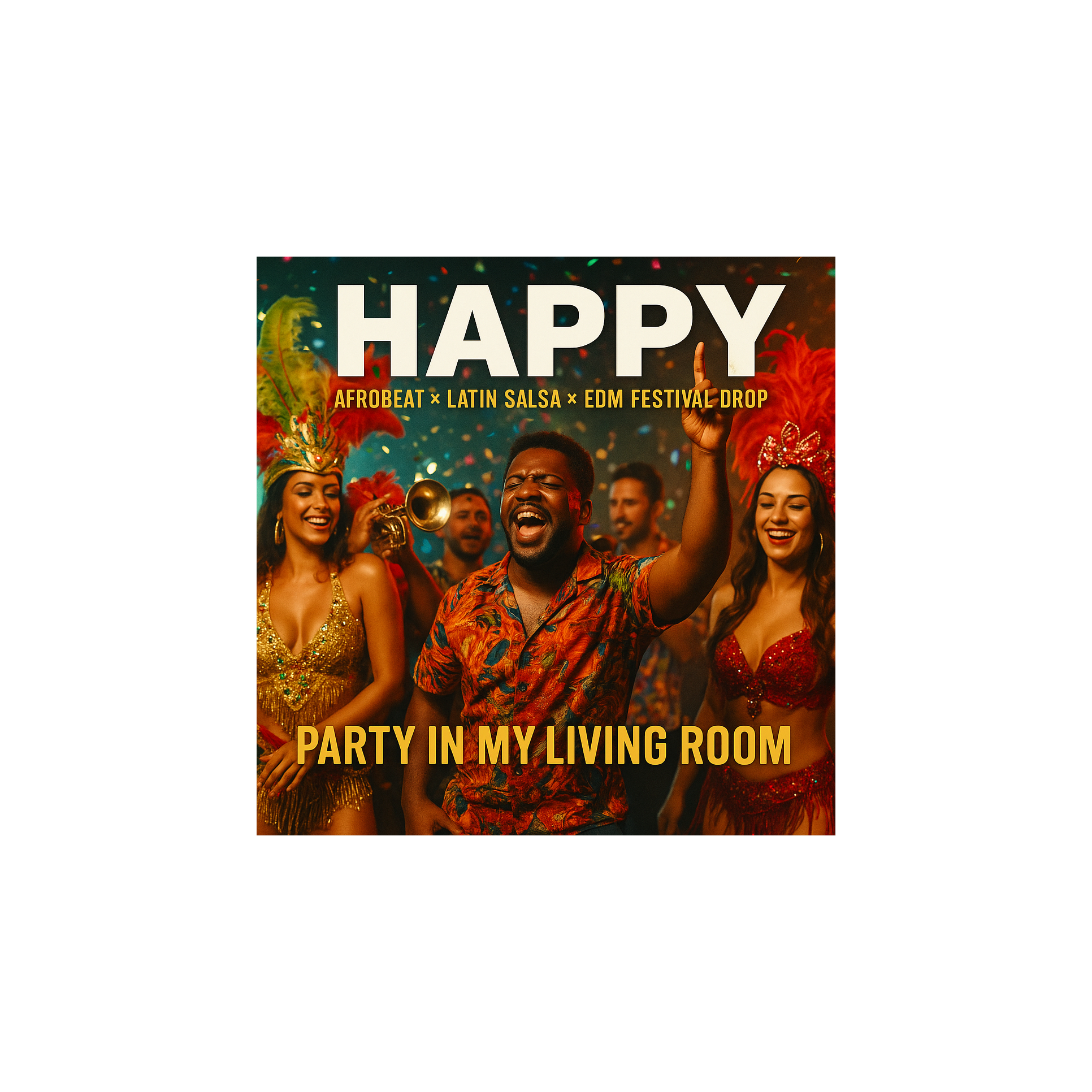 A global carnival fusion remix blending Afrobeat grooves, Latin salsa horns, and EDM festival drops, Vocals: rap verses layered with chant-style crowd vocals and melodic hooks, Style: Afro-Latin x EDM, Instrumentation: Afro percussion (congas, shakers, log drums), Latin brass (trumpets, trombones, timbales), groovy basslines, and EDM supersaw synth drops, Verses: Afrobeat groove with rap and claps, Pre-chorus: salsa horns building energy, Chorus: explosive EDM festival drop with Latin brass riff as main hook layered over pounding kicks and Afro shakers, Bridge: stripped conga + trumpet solo, then slammed into a full EDM-Latin explosion, Tempo: 118–124 BPM, Mood: vibrant, euphoric, carnival-style celebration built for festivals, clubs, and street parties worldwide