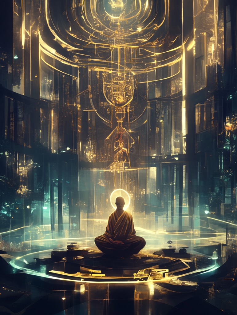 A spiritual-mechanical psytrance journey with reversed Buddhist chants and robotic voices reciting existential phrases in a sonic mandala