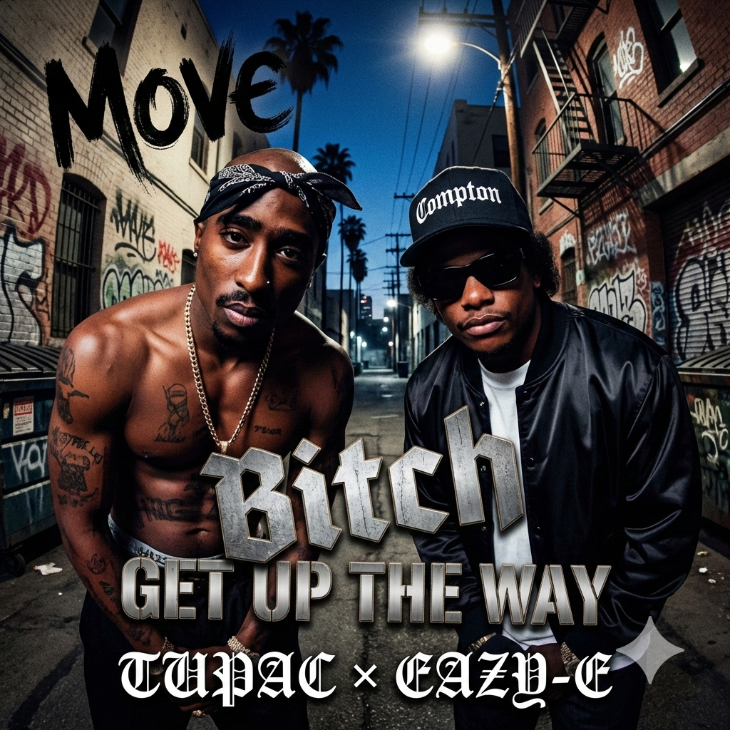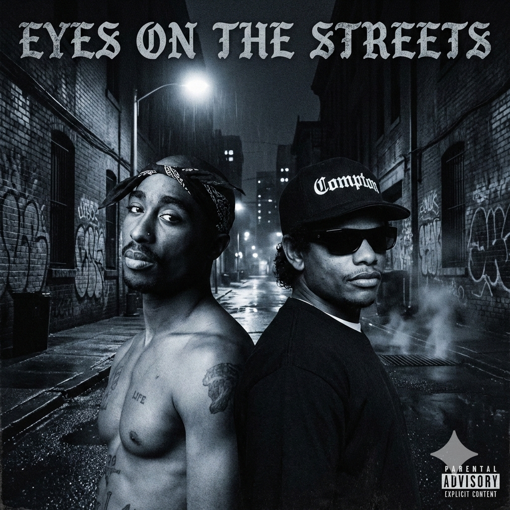90s West Coast gangsta rap duet inspired by Tupac and Eaazy-E, No female vocals, Tempo around 92 BPM, Heavy G-funk bassline with analog Moog sub, tight 909 drums, low piano stabs, siren samples, and dark synth leads, Vocal 1: deep male, calm but commanding voice like Tupac — bass-heavy tone, poetic flow, steady tempo, storytelling with emotion and authority, Vocal 2: sharp nasal male like Eaazy-E — high energy, fast attack, punchy and aggressive, rapid-fire bars with tight timing, Delivery: raw, confident, streetwise, full of attitude and realism, No auto-tune, no soft effects — dry, gritty mix, Mood: real thug life, asphalt soul, loyalty, rebellion, and pride, Structure: intro (spoken) → verse1 (Tupac) → verse2 (Eazzy-E) → hook (both) → verses alternate with hard call-and-response ending, Cinematic, powerful, and timeless OG West Coast energy