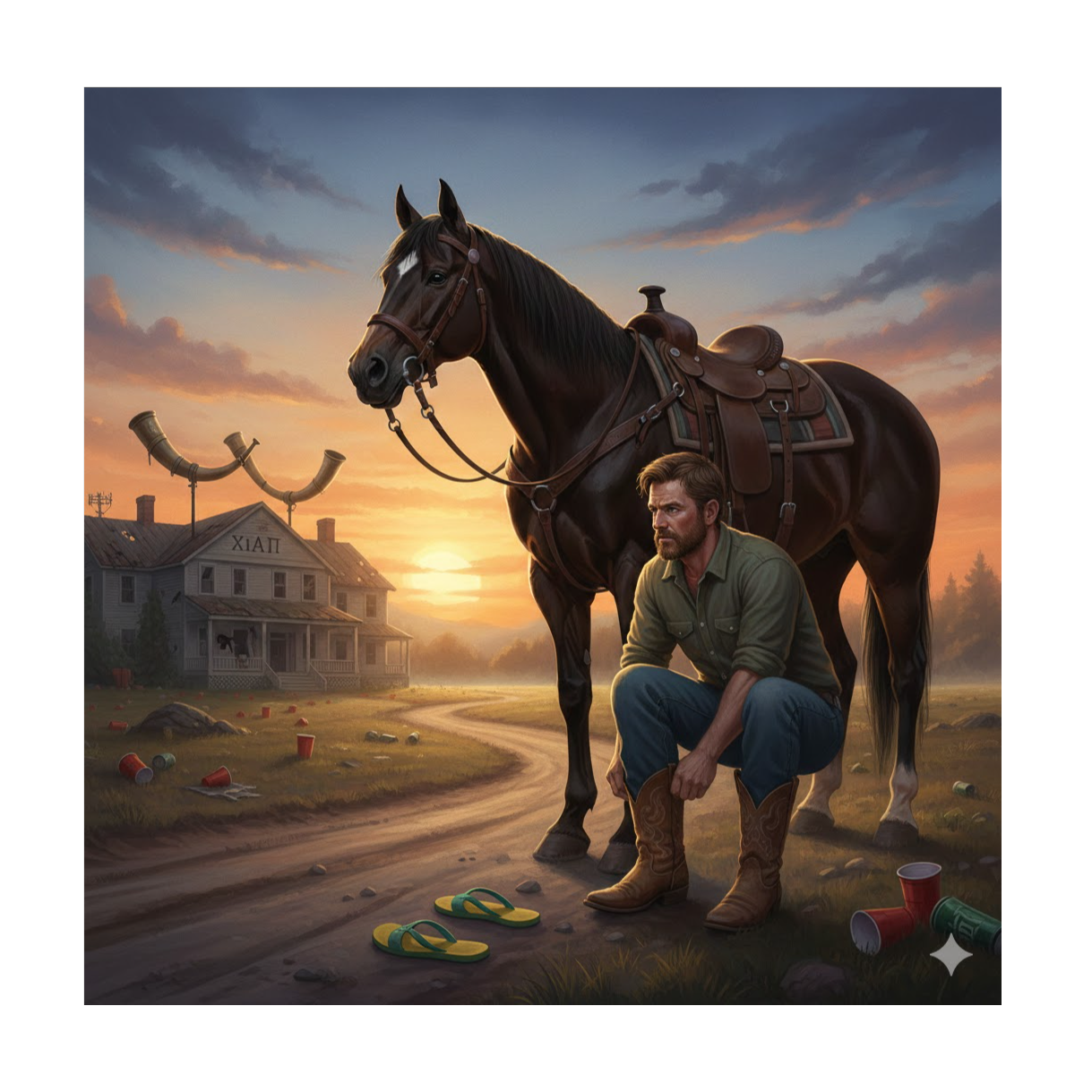 [The track features a mid-tempo walking bassline and a percussive acoustic strum, The "Ancient Horns" (like a Carnyx or Shofar) blare intermittently, sounding like a foghorn cutting through the "frat-boy" noise, The Chanting is sharper here, staccato and rhythmic, providing a pulse of discipline, Layered underneath is the faint, annoying sound of a distanced party (clinking bottles and muffled laughter) that slowly gets drowned out by the gravity of the horns as he moves further away, ]