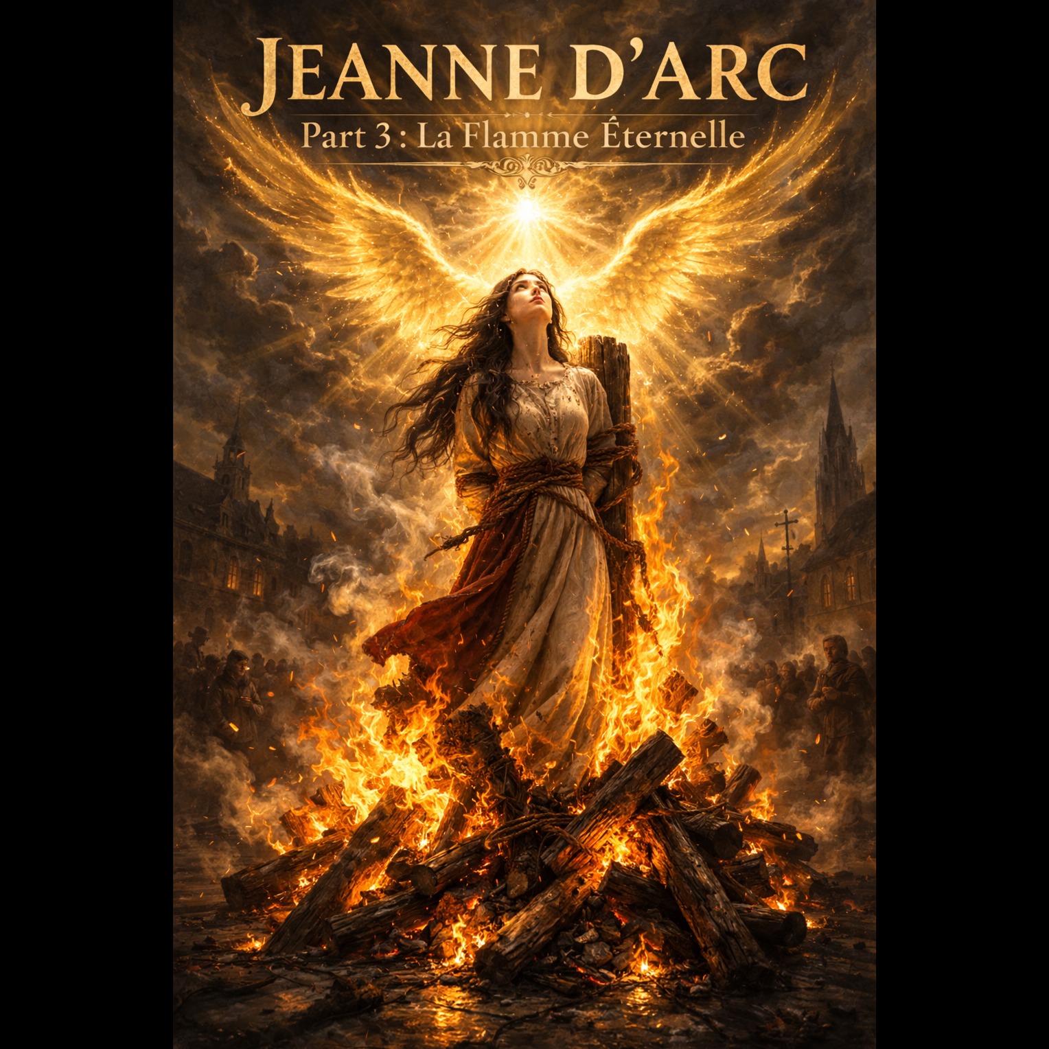 Sacred judicial deep dubstep at 140 BPM, halftime 70, darker and austere, heavy pure sine sub 38–42 Hz mono with long rounded envelopes and slow breathing sidechain, restrained tight kick and distant rimshot creating cold negative space, low bowed medieval strings and pipe organ drones in vast stone cathedral reverb, sparse vielle and dulcimer motifs processed through granular delay and spectral diffusion, subtle metallic chains, wooden creaks and distant murmurs as rhythmic foley, intimate unwavering French female vocal with minimal shimmer, harmony in D dorian with colder modal shifts to evoke trial tension, low liturgical choir drones slowly rising, ceremonial toms entering gradually, crackling fire textures blending into high noise swells, final lift into radiant organ chords and expansive choir, sub steady and grounded while upper harmonics ascend into transcendence, cinematic depth, sacred gravity