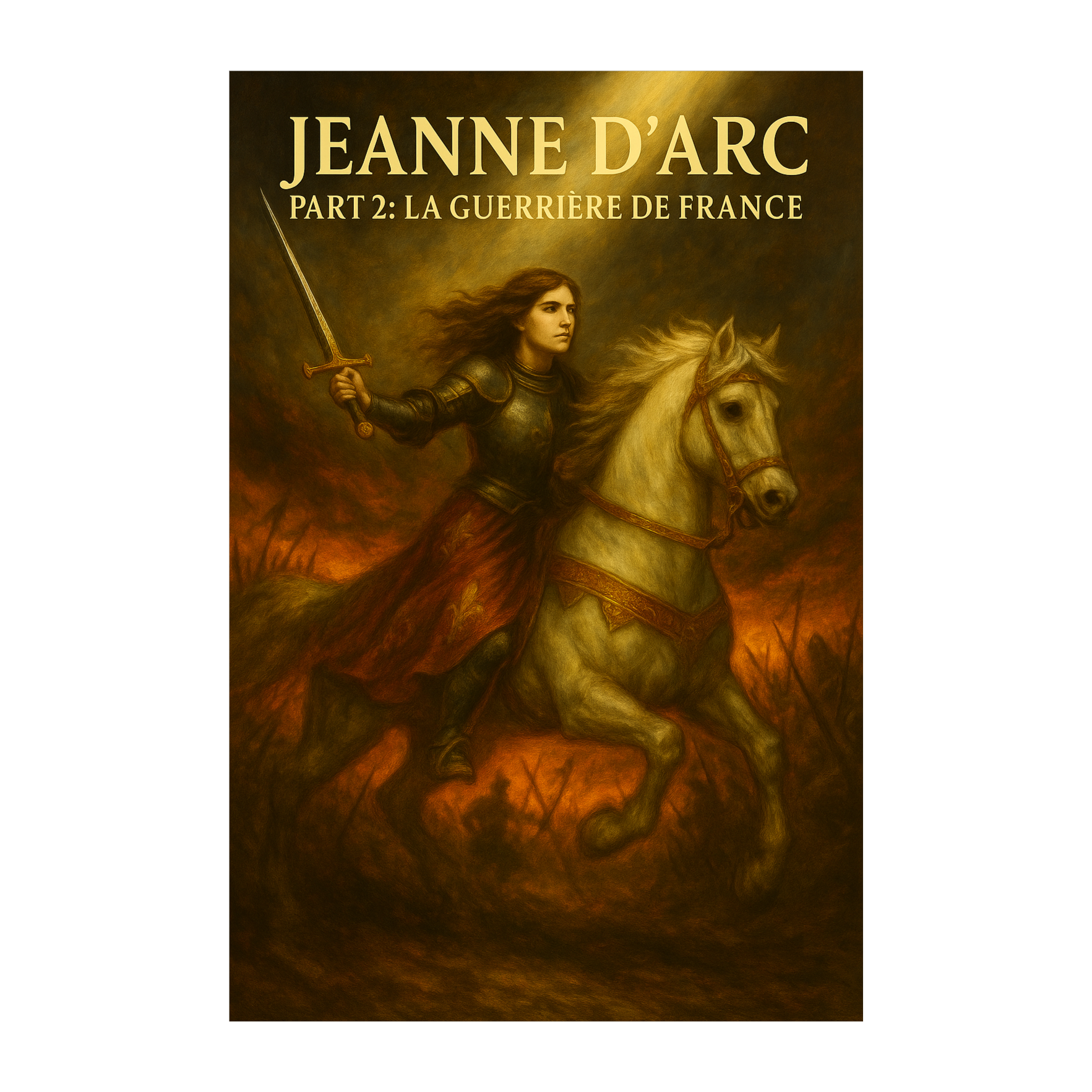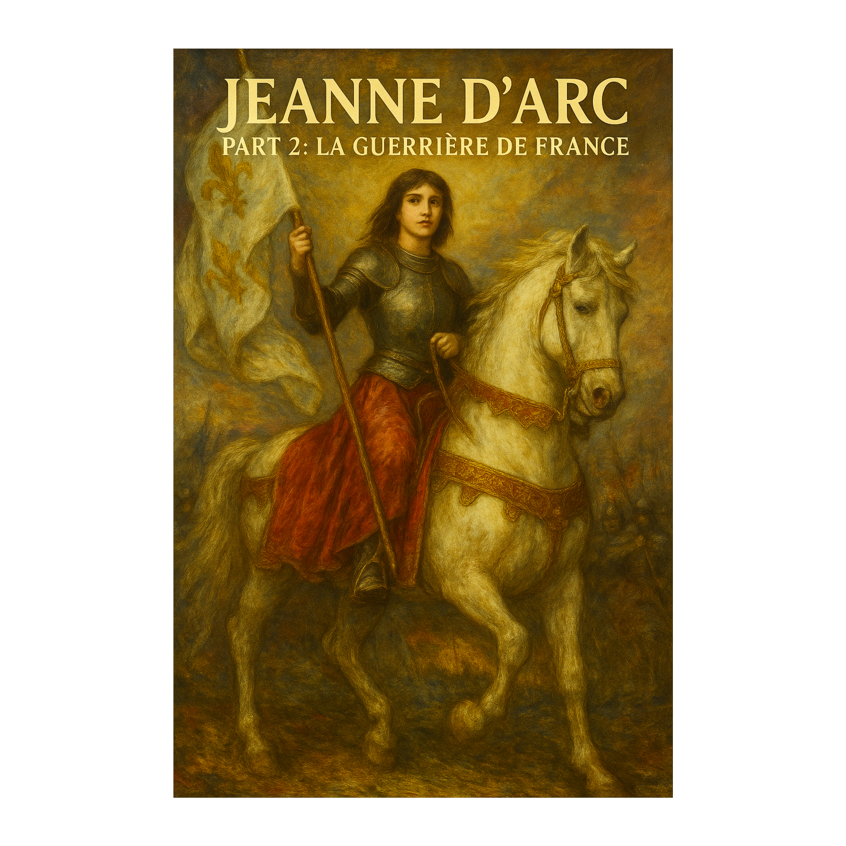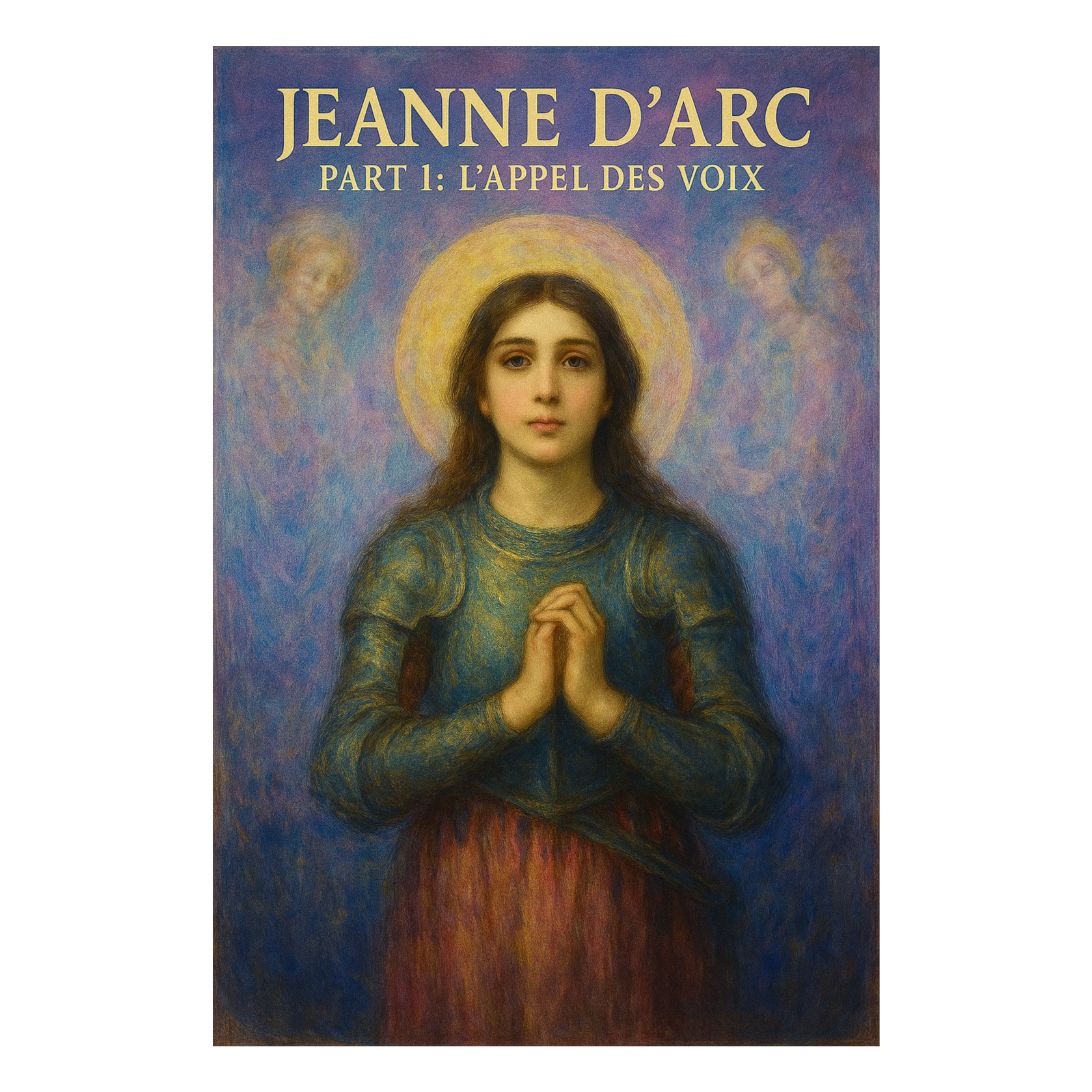 Sacred cinematic deep dubstep at 140 BPM with halftime feel around 70 BPM, blending orchestral grandeur and mystical French folk textures, Deep sine sub with warm compression and sidechain breathes under tight kick and soft rimshot, Layer analog pads and pipe organ drones with medieval strings (vielle à roue, dulcimer, bowed rebec), framed by large cathedral reverb and stereo shimmer, Ethereal female voice in French, processed with long plate tails and spectral diffusion, Add slow ceremonial toms and orchestral hits for dramatic lift, with granular chant fragments and ambient foley from historical battlefields and church interiors, Harmony based on D dorian with modal chord shifts to evoke divine intervention, Choral textures and harmonic drones rise toward radiant final chorus, merging war and prayer into transcendence, Rich stereo field, sacred atmosphere, cinematic depth