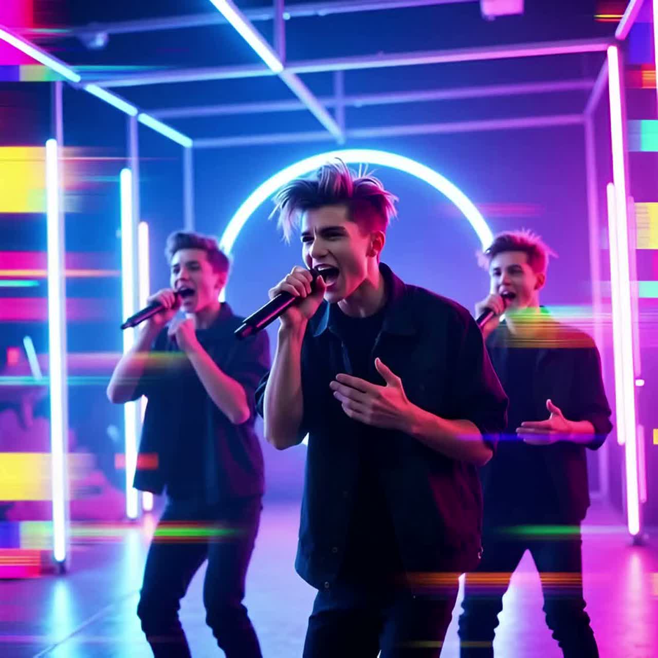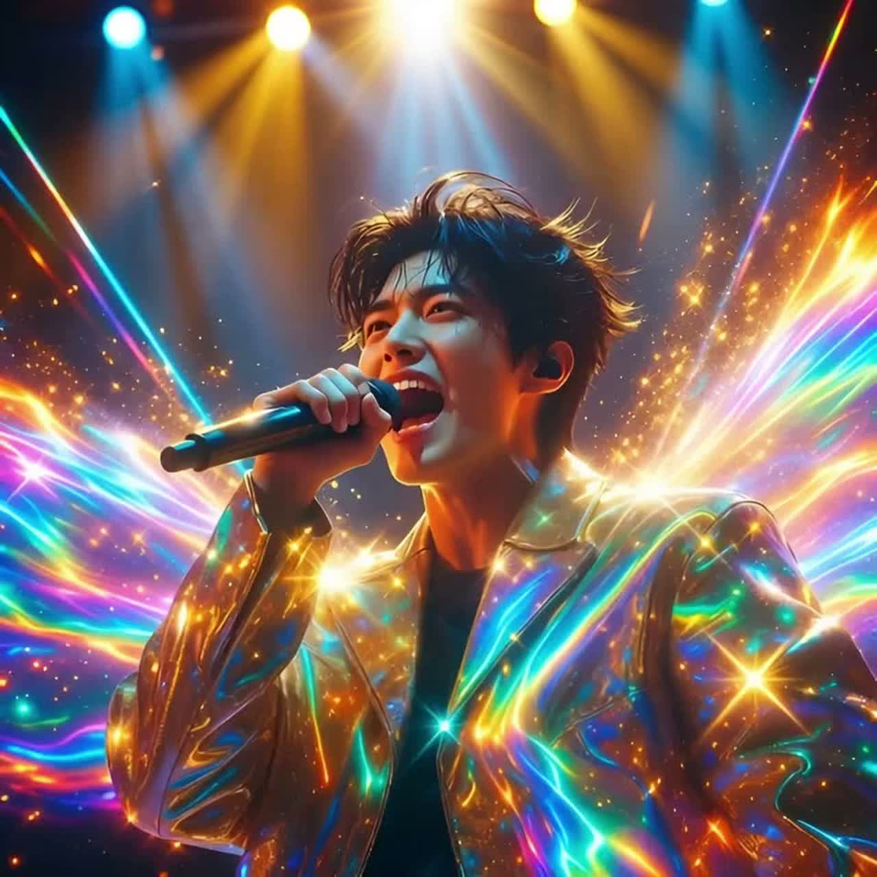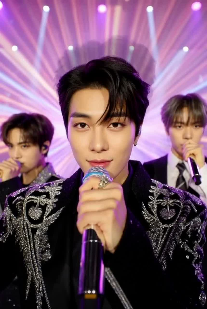 High-energy K-Pop and J-Rock fusion featuring bright, distorted electric guitars and a driving 4/4 drum beat at approximately 165 BPM, The arrangement is dense with layered synthesizers, a prominent slap bass line, and orchestral hits that accentuate the transitions, The male vocals are energetic and melodic, utilizing a wide range with occasional belting and rhythmic delivery in the verses, The chorus is anthemic, characterized by soaring vocal harmonies and a powerful, uplifting chord progression (I-V-vi-IV), Production is polished with modern compression, subtle pitch correction, and spatial reverb on the vocals to create a large, stadium-like sound