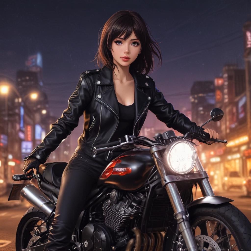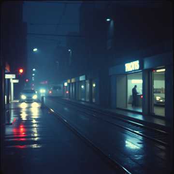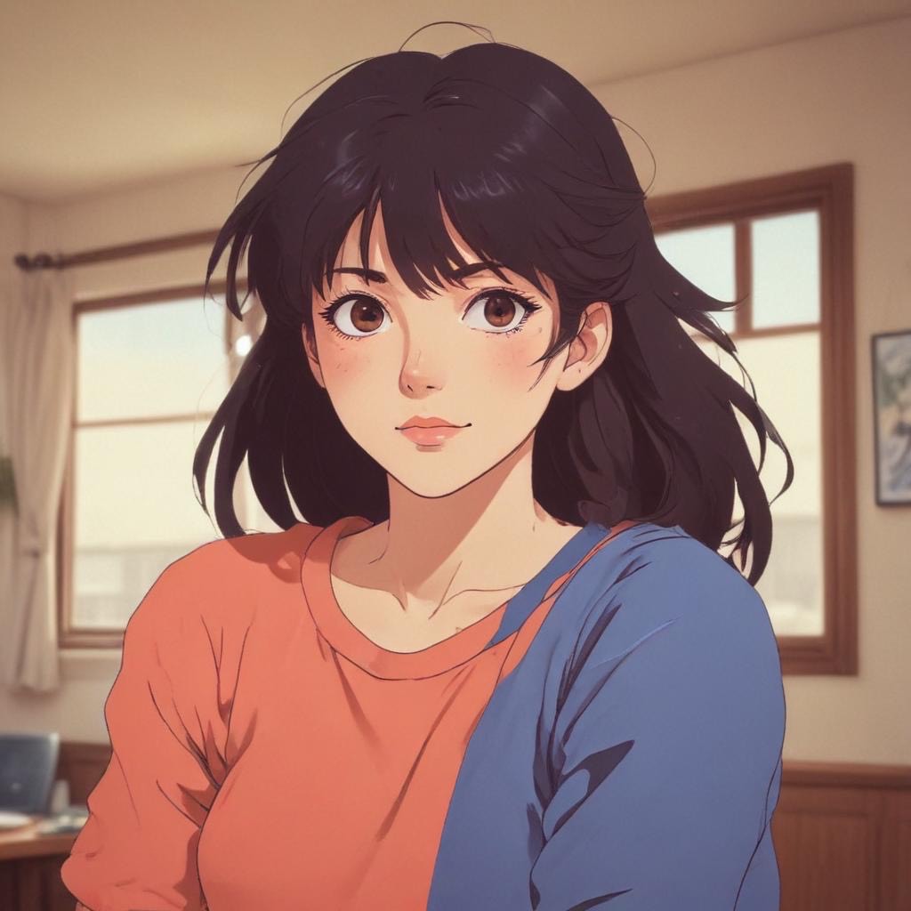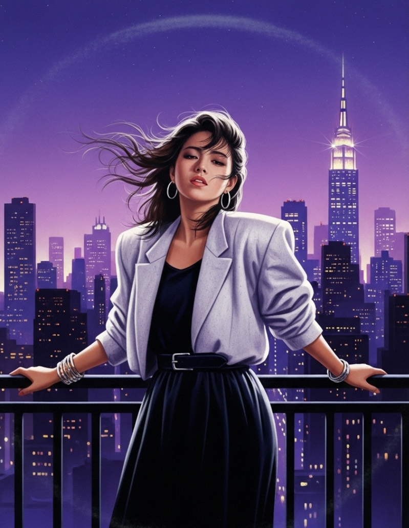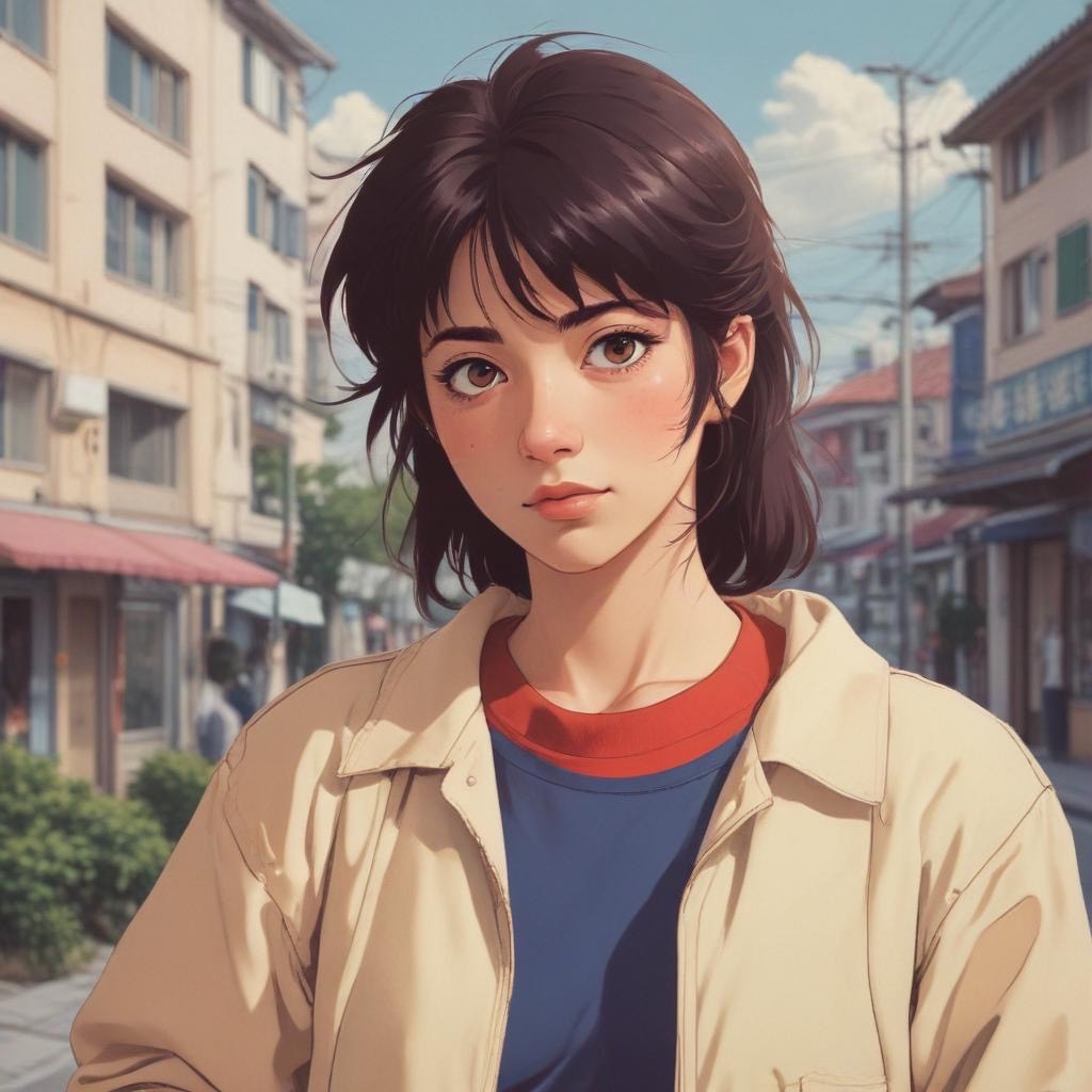 > *"Late 1980s Japanese city night scene, slightly foggy neon-lit streets, A young woman with short hair walks alone wearing a faded denim jacket and a mini skirt, her expression hiding a touch of loneliness beneath a In the atmosphere, imagine the sound, sharp electric guitar cutting rhythms, a smooth, pulsing synth bass line, shimmering synth pads, and tight snare and hi-hat beats that echo the pulse of the city, Neon lights in red, blue, and purple wet pavement, Capture the mood of urban solitude and glittering allure, Shot with a cinematic angle from waist height, shallow depth of field, neon bokeh in the background, film grain texture for an authentic 1980s analog feel, "*