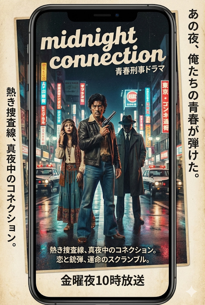 1979 Japanese Kayokyoku, Showa Pop, TV drama theme style, Male vocals, cool and slightly muttered delivery, unique phrasing, spoken-word verses, Dramatic arrangement with sweeping strings, sharp brass stabs, warm electric piano, and a funky walking bassline, Mid-tempo, urban night atmosphere, melancholic yet catchy, nostalgic, cinematic production