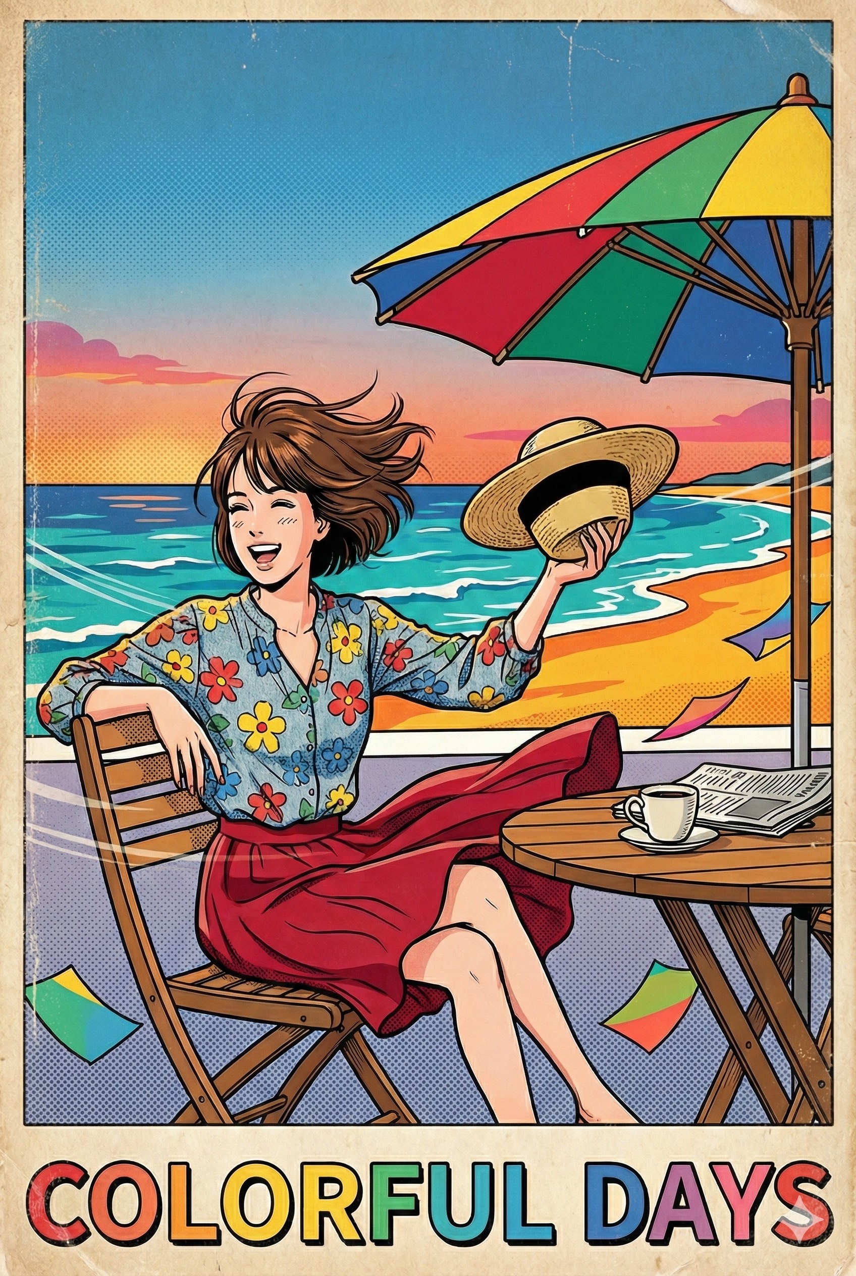 male vocal, Make a song in the style of Eiichi Ohtaki, inspired by Japanese city pop from the early 1980s, Upbeat tempo, nostalgic summer feeling, bright melodies, lush harmonies, and retro instrumentation such as electric guitar, saxophone, and synths, Light, dreamy vocals, with lyrics about youthful romance and memories of a seaside vacation, Clear, breezy arrangement reminiscent of the album "A LONG VACATION"