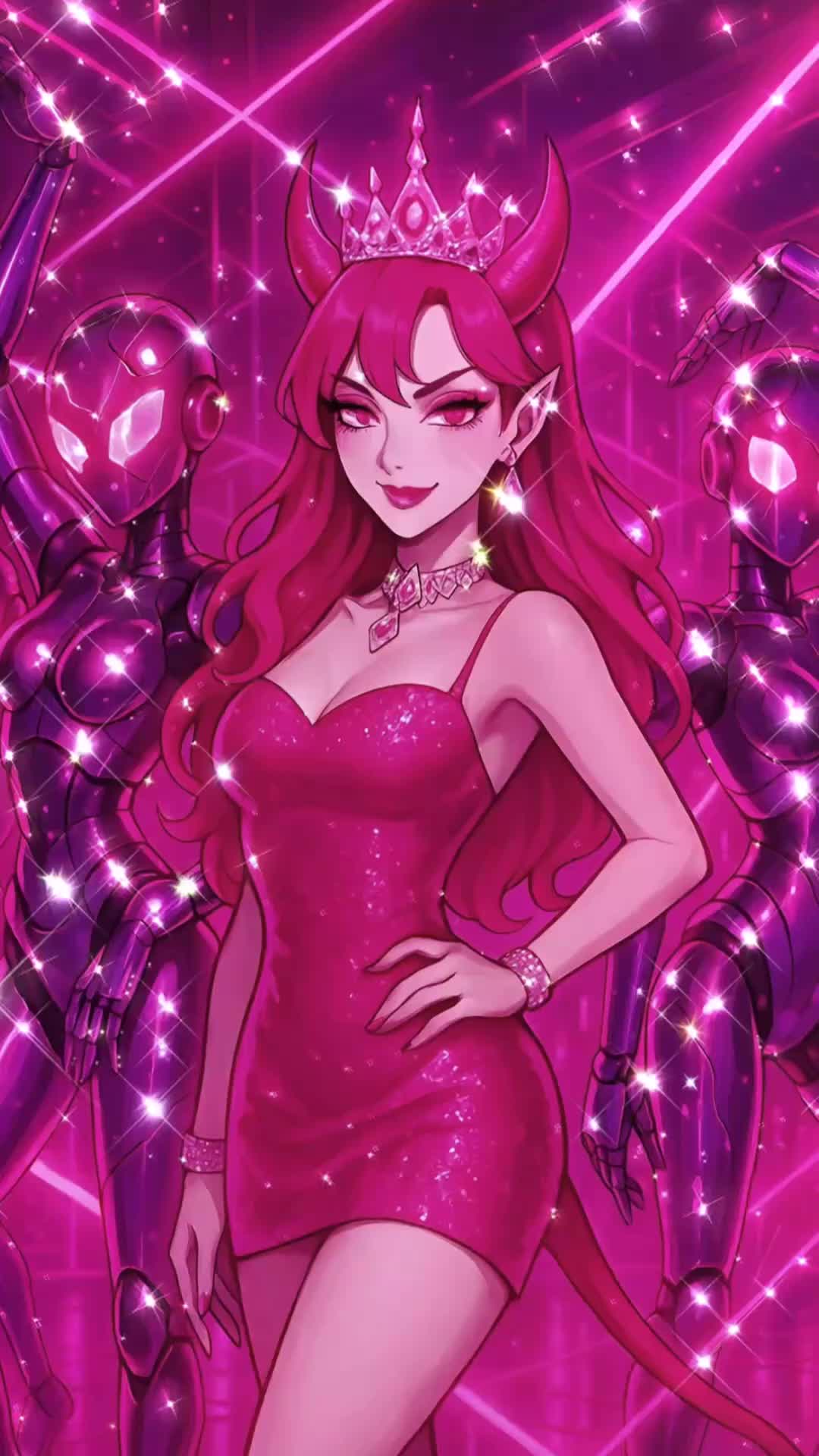 Dubstep, Electro Pop, Glitch Dance, Glitch Pop, Glitch Industrial Pop, Glitch FX, Chopped Vocals, Robotic Glitch, Robotic Vocals, Edm, Dark EDM, Dark Allure, Techno, Synthwave, Dark Synth, Trap, Vocals: Mix of robotic vocoder effects and sultry pop delivery, Bassy wubs, Trap hats, Glitchy stutters and rewind FX, Vocal Chops, Ambient dream synths in breakdown, Catchy and strong rhythmic flow, and make the AI androids the center of the spotlight—Pink Devil’s hypnotic backup dancers, powered by glitchy beats and neon code, Club song, Vibe: Electric, surreal, futuristic, chaotic but catchy, Melodic Vocals