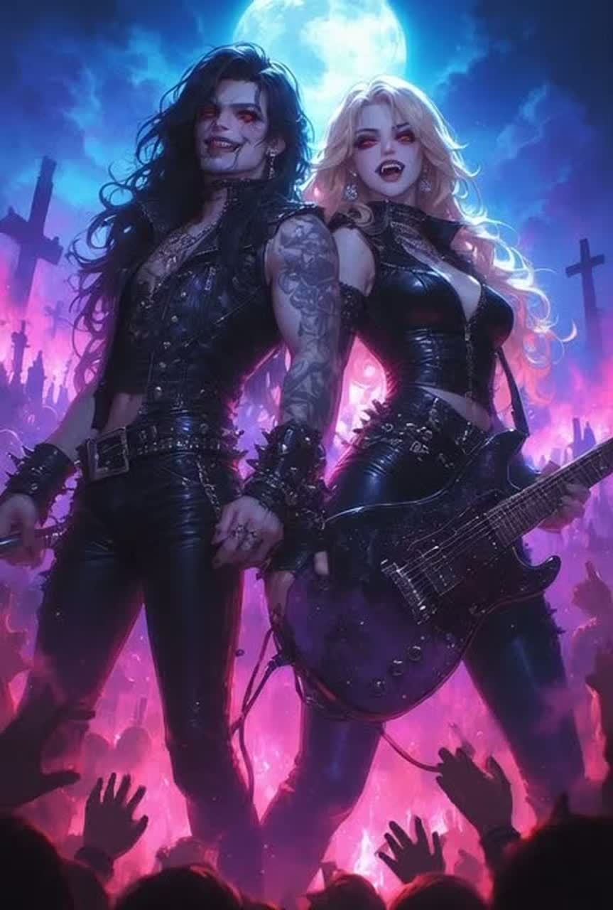 [Genre] Hair glam metal/rock, theatrical, Gothic, Halloween vibes, over the top, energetic, 80's styled, ghostly, dark, night vibes, reminiscent of hearbeat, [Vocals] Deep male baritone vampire primary voice, female vampiress vocals, duet