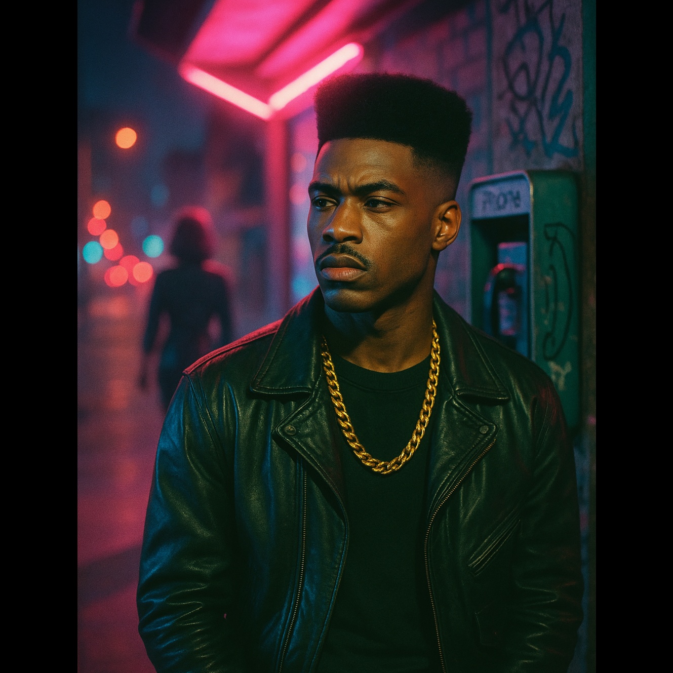 Upbeat 1980s-style dance-pop pulses with punchy drum machine hits and a percussive synth hook establishing a dynamic groove, Bouncy synth bass underpins deep, soulful baritone male vocals, Layered harmonies boost the chorus, while sparkling pads and gated reverb snares energize instrumental breaks