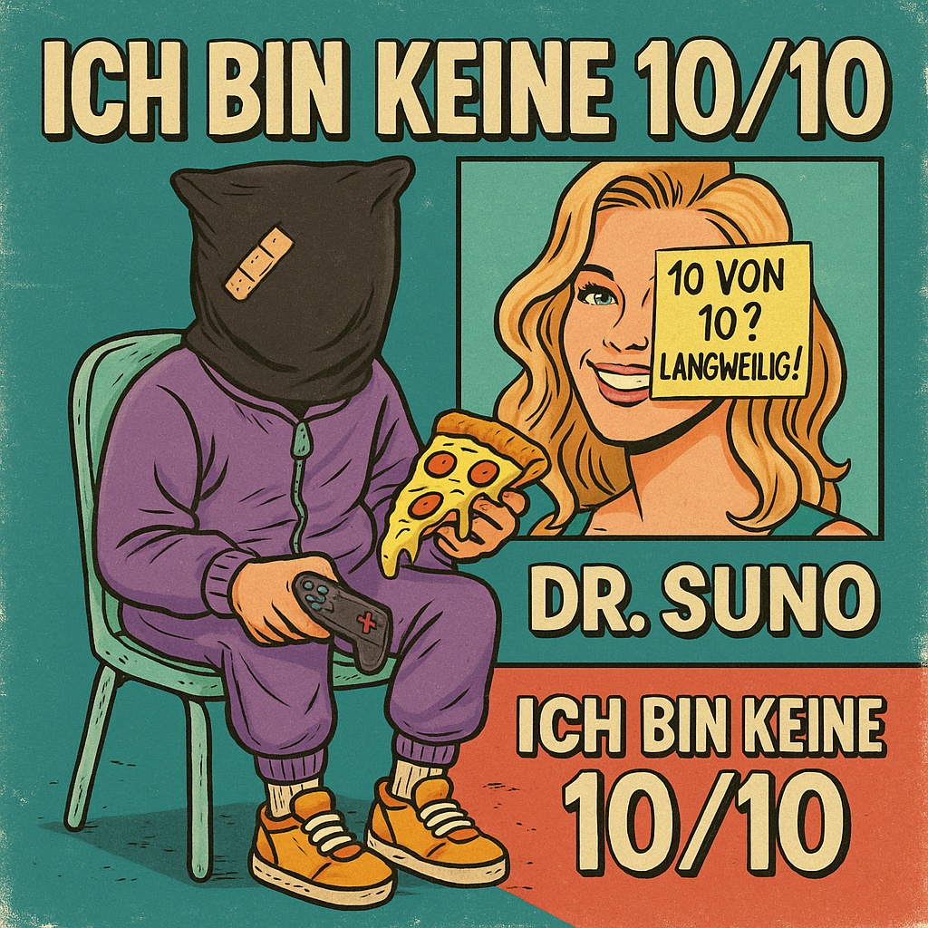 Pop-Rap mit Funk-Punk & Comedy-Rock, melodisch, [Sample Crowd FX], hyperpop-FX elemente, 98 BPM, TR-808, dark-wave, ambiente SFX