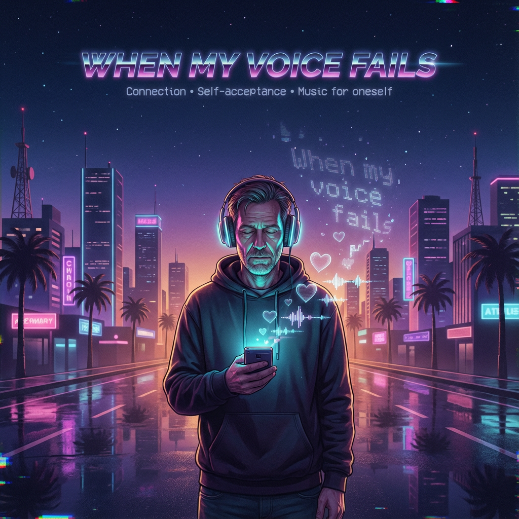 1980s-inspired synthwave, retro-futuristic, nostalgic, emotional, mid-tempo (92–100 BPM), analog synths, warm Juno-style pads, pulsing arpeggiators, gated reverb snare, LinnDrum-style patterns, deep analog bass, shimmering chorus effects, subtle tape saturation, wide stereo image, dreamy and melancholic but hopeful, cinematic night drive atmosphere, neon-lit cityscape vibe, emotional male vocal, slightly breathy, intimate verses with anthemic chorus, reflective and meta-lyrical tone, minimal guitar, focus on synth layers, sidechained pads, subtle vocoder harmonies, reverb-heavy bridge, strong hook-driven chorus, classic 80s pop structure, nostalgic but modern production, inspired by The Midnight, FM-84