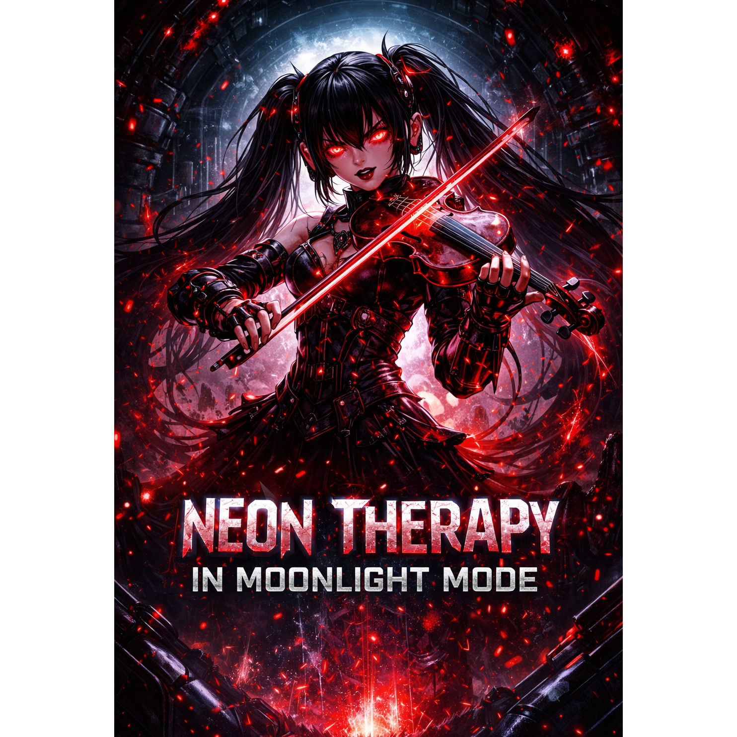 Opening with a wall of aggressive, distorted violins (+4dB, centered, dark and intense), the track hurtles forward on a fusion of hardtekk percussion, stomping EBM grooves, and seismic bass, Raw violin stabs and haunting string drones slice atop metallic synths and eerie pads, supported by hyper-processed, nightcore-pitched Vocaloid female vocals, Violin leads cut through glitchy drops, with metallic textures and horror FX flickering across a wide stereo field, violins anchored at center, synths subtly panned for relentless industrial-hardstyle energy
