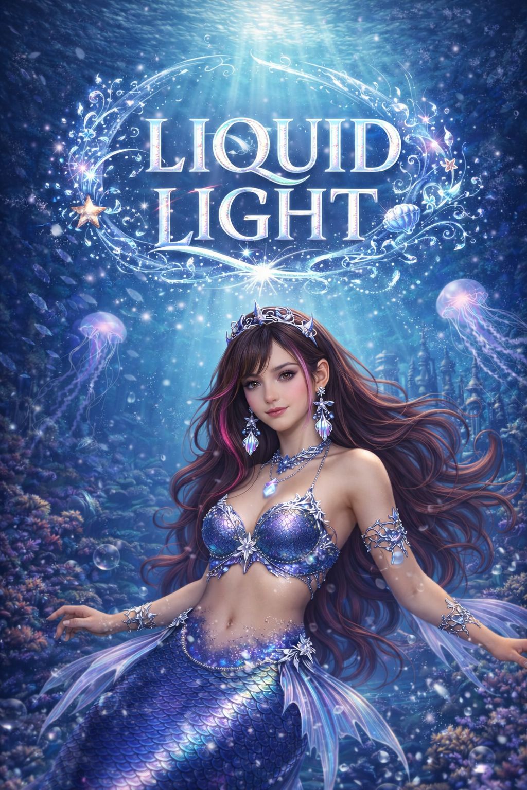 Cinematic orchestral fantasy pop ballad, magical water kingdom, luminous and emotional banger, female ethereal vocal from the sea, warm and hypersensitive mood, fairy tale bedtime feeling, gentle but powerful, shimmering strings, harp, soft piano, deep choirs, ocean textures, subtle waves and bubbles, emotional build with strong chorus, princess of water with a golden soul, kindness and light, water as comfort and refuge, cinematic depth, high production, dreamy but uplifting, no male voice, no rap, no aggressive drums, immersive and magical