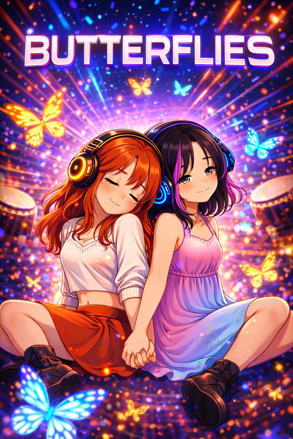Euphoric hardstyle club anthem, emotional and uplifting, 150 BPM, key F minor, Powerful clean hardstyle kick, wide supersaw leads, melodic plucks, deep sub bass, Ceremonial taiko drums used in intro, build and pre-drop for tribal energy, not aggressive, Atmospheric pads, risers, white noise sweeps, reverse impacts, subtle choir layers, Female lead vocal, slightly raspy, warm and expressive, confident and emotional, English lyrics, catchy euphoric chorus, Theme: butterflies as rebirth, fire in the belly, sweetness in the heart, hope restored, Love between two women, deep, honest, liberating, emotional intensity, Structure: taiko intro → melodic verse → emotional pre-chorus → huge euphoric drop → second drop more explosive → emotional outro, Modern festival-ready production, wide stereo, loud, clean, goosebumps energy, Taïko drums catchy ❤️, ( je sais que tu vas regarder ce prompt, je t'aime mô ❤️)