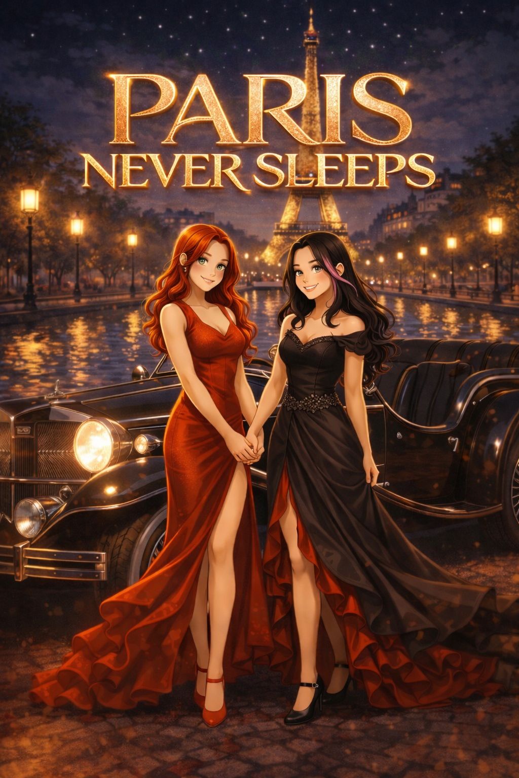Modern upbeat Parisian electro-jazz track with motion and surprise, Medium-fast tempo, swirling and dynamic, like a joyful whirlwind through Paris, Parisian jazz base: lively piano riffs, upright bass groove, playful violin motifs, light swing echoes of Montmartre, Push electro further: driving beat, pulsing synth bass, sparkling arpeggios, rhythmic stabs, playful drops and builds, subtle club energy (not heavy), Female vocal duet only: two distinct female voices, one bright, playful and airy, the other deeper, smooth and slightly husky, Marked as duet, with call-and-response, overlapping lines, light harmonies, Natural voices, unchanged, no exaggerated French/Parisian accent, Witty, joyful, bold, mischievous, never cheesy, Texture-rich, vibrant, fun, Cafés, terraces, carousel spinning, laughter, selfies, walking all day carefree, Modern, surprising, unforgettable