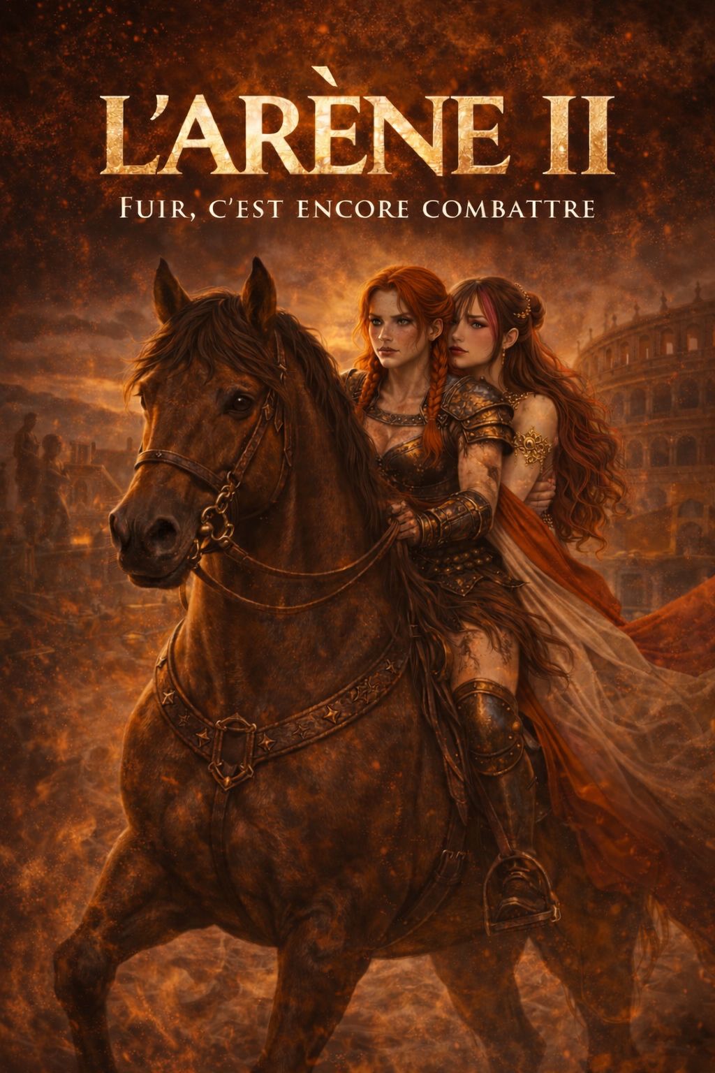 Intense rising choir intro with deep war drums and taiko rhythms, epic ancient orchestral action music inspired by gladiator arenas, Powerful low strings, aggressive rhythmic ostinatos, dramatic brass and raw tribal percussion, Male and female choirs chanting in archaic Latin, with crowd-like arena acclamations and ritual vocal phrases, evoking fate, sacrifice, love and death, Fast tempo, cinematic and immersive, Dark romantic atmosphere filled with dust, fire and stone, Subtle restrained electronic pulses for tension, but orchestral forces, taiko drums and Latin choirs remain dominant