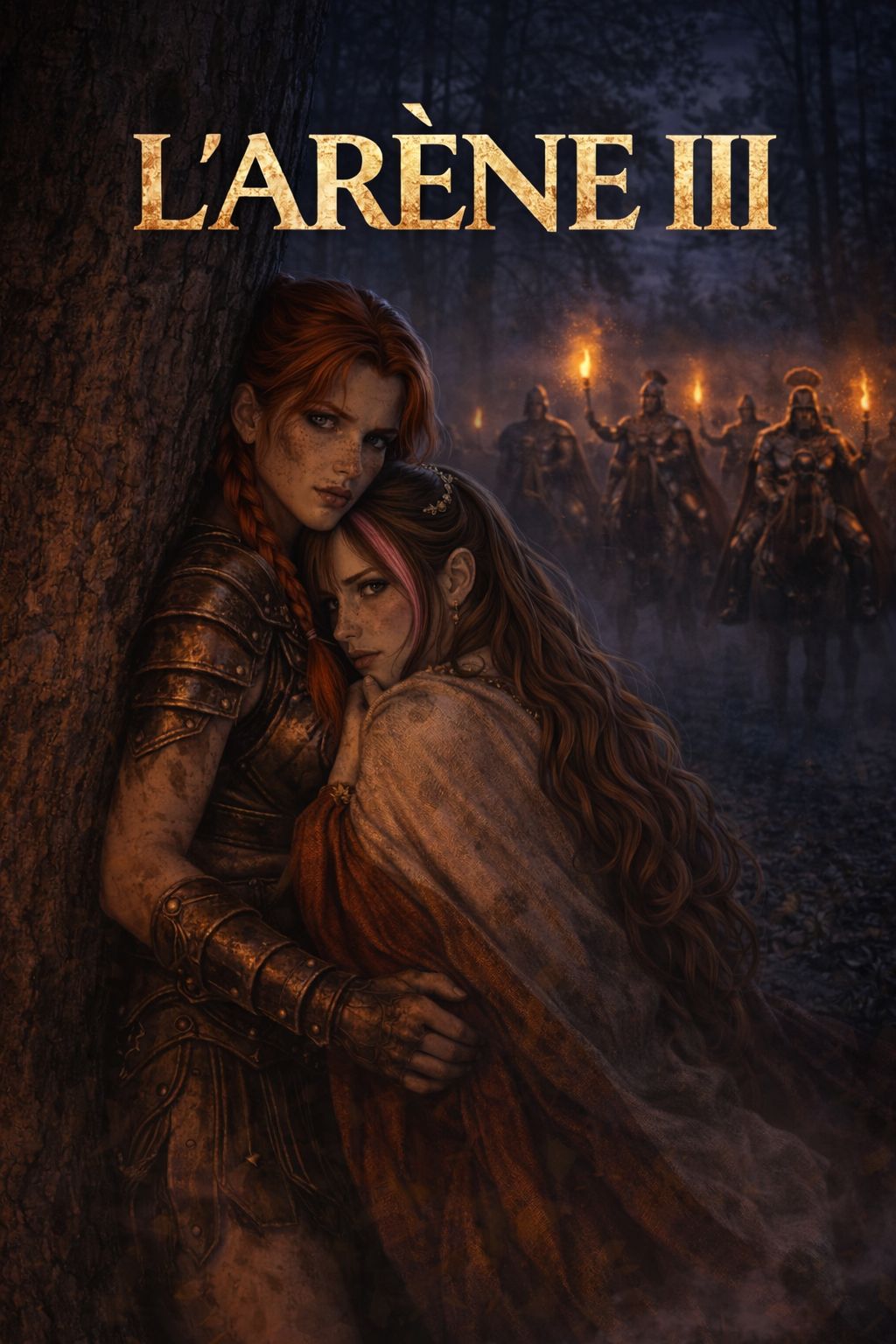 Epic cinematic instrumental score set in Ancient Rome, “The Arena III: The Run”, Tense nocturnal chase through forest, torches in the distance, cliff edge at dawn, Hybrid orchestra + subtle modern electronic pulse, Driving taiko drums, low strings ostinato, thunderous brass swells, deep war percussion, granular synth textures, cinematic impacts, Wordless Latin choir with intense rising choir waves, occasional whispered chant “Fatum” used as rhythmic accent, Wide film-mix reverb, dramatic crescendos, sharp cut-backs, breathy pauses, Structure: [Intro dark drones] [Build taiko + ostinato] [Theme heroic strings] [Break instrumental silence + rising choir] [Chase drop with electronic pulse] [Final crescendo to cliffhanger hold, unresolved last chord], Tempo 110 BPM, minor mode, powerful, raw, emotional, legendary, epic, cinematic, dynamic