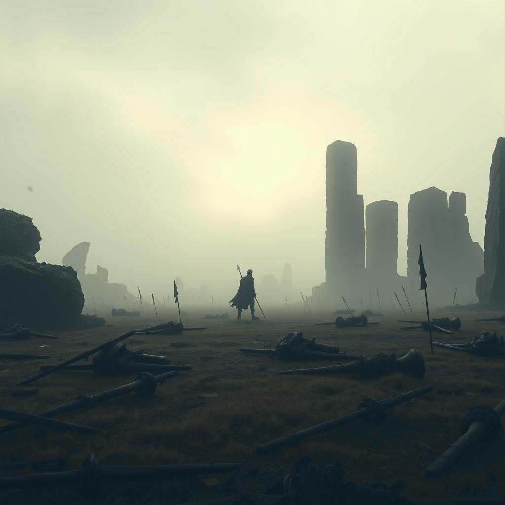 Epic fantasy barbarian RPG ambient soundtrack, atmospheric and immersive, tense but calm, evocative of wild landscapes and ancient ruins, cinematic textures, slow-to-medium tempo, natural and raw, subtle Arabic and Oriental influences, ocarina, warm primitive harmonic sheen, fading immersive ending, ancient warrior tribe music, sword-and-sorcery ambient influence, subtle environmental pacing, few layered ambient textures, ancient ritual traditions, ancient ritual melodic line, soft barbarian ambient glow, hand drum, low haunting harmonic movement, light horizon-inspired harmonic shimmer, quiet atmospheric drift, soft cinematic layering, haunting wilderness solitude, short reflective interludes, misty primeval forest