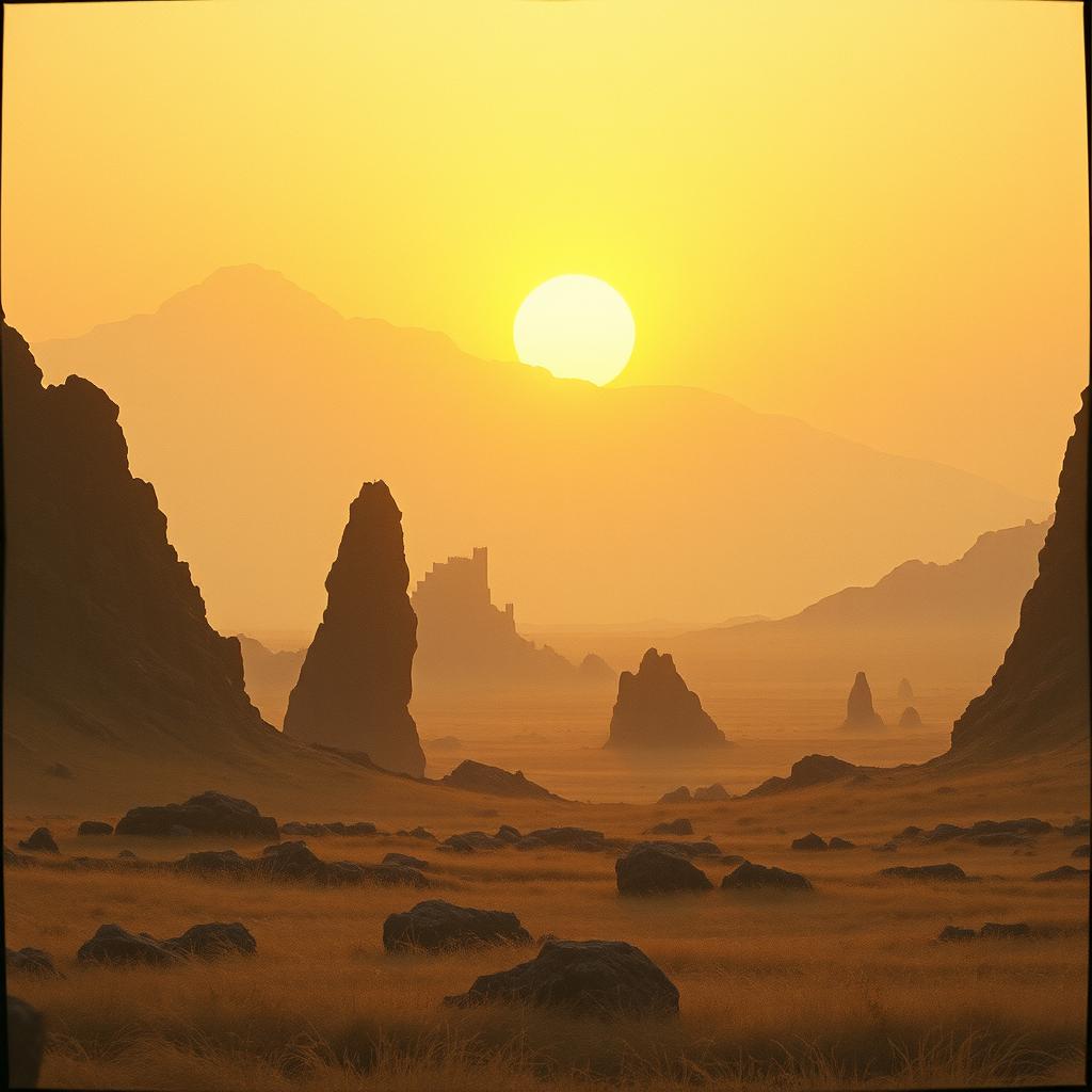 Epic fantasy barbarian RPG ambient soundtrack, atmospheric and immersive, tense but calm, evocative of wild landscapes and ancient ruins, cinematic textures, slow-to-medium tempo, natural and raw, subtle Arabic and Oriental influences, sunlit savannah expanse, slow wandering cadence, gentle primal harmonic texture, early sword-and-sorcery lineage, dulcimer, gradual addition of harmonic layers, quiet ambient space, low haunting harmonic movement, lute, hidden cave ambience layers