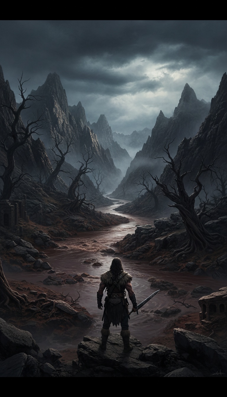 Epic fantasy barbarian RPG ambient soundtrack, atmospheric and immersive, tense but calm, evocative of wild landscapes and ancient ruins, cinematic textures, slow-to-medium tempo, natural and raw, subtle Arabic and Oriental influences, ancient ritual traditions, gradual ritualic rhythm, remote river valley, repetitive ambient stanza, subtle primal melodic drift, soft cinematic layering, gradual addition of harmonic layers, soft nomadic pulse, ancient ambient purity, hidden forest ambience layers, soft northern wind undertone, frame drum, layered drifting motifs, vast untamed acoustic layers, hidden jungle enclave, wilderness folk heritage, soft wandering pulse, subtle foggy harmonic layers, rustic fiddle