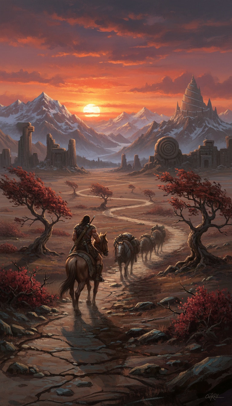 Epic fantasy barbarian RPG ambient soundtrack, oriental, atmospheric and immersive, tense but calm, evocative of wild landscapes and ancient ruins, cinematic textures, slow-to-medium tempo, natural and raw, barbarian legend-inspired melodies, slow cinematic melodic drift, minimalist acoustic layering, rustic zither, low haunting harmonic movement, soft ceremonial beat, gradual addition of harmonic layers, fluid transitions between textures, vast untamed wilderness, primitive ambient soundscapes, soft wandering texture, soft ritualistic motif, jaw harp, hypnotic evolving ambient mood, ancient wilderness flavor, gradual ritualic rhythm