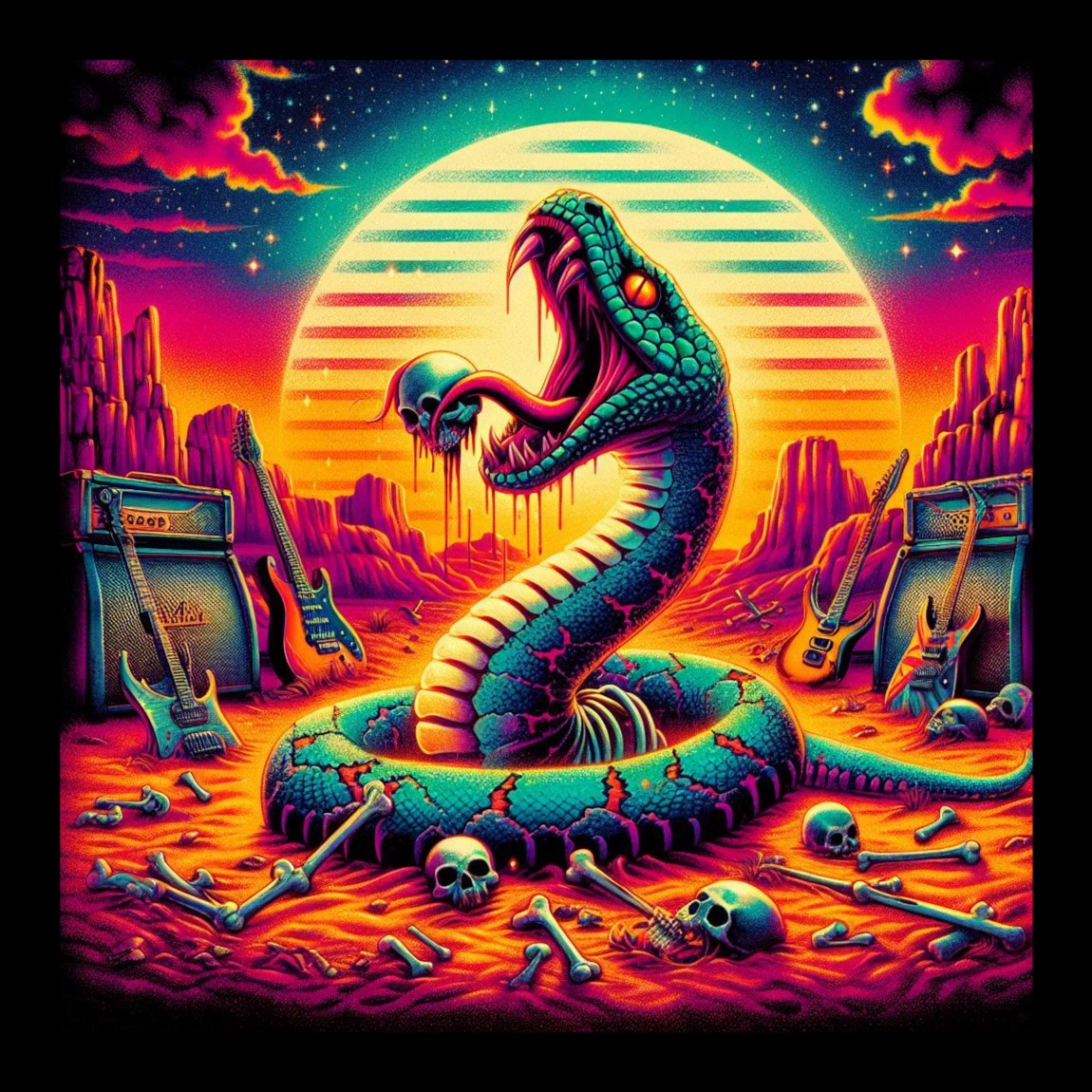 Create a heavy stoner metal song in the style of Kyuss' 'Green Machine' with slow, groovy 85 BPM riffs, fuzzy bass tones, and psychedelic desert rock vibes, Features echo-drenched vocals singing about serpent worship and desert hallucinations, with a wah-drenched guitar solo and massive chorus chants of 'DUST SERPENT COMMUNION', Include tribal drumming, sustained feedback notes, and a gradual build in intensity