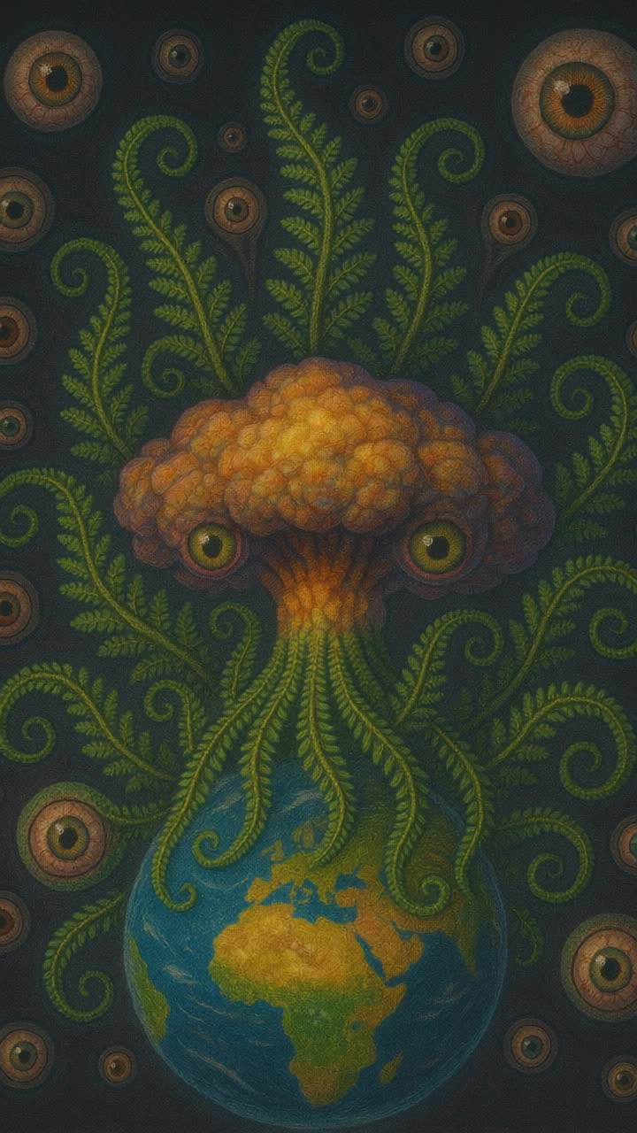 soft gentle math staccato deadpan robotic vocoder harmonies that bloom into powerful gospel-choir unison over a shoegaze granular-synthesis distorted boom-bap industrial-stomp breakbeat section, followed by a crystalline-fractal decay sequence, featuring microtonal drone, glitch-hop skittering, and a clockwork gamelan shimmer-swell, and an outro of oud-reverb-pulse morphing into a final deep sub-bass crackle-hiss