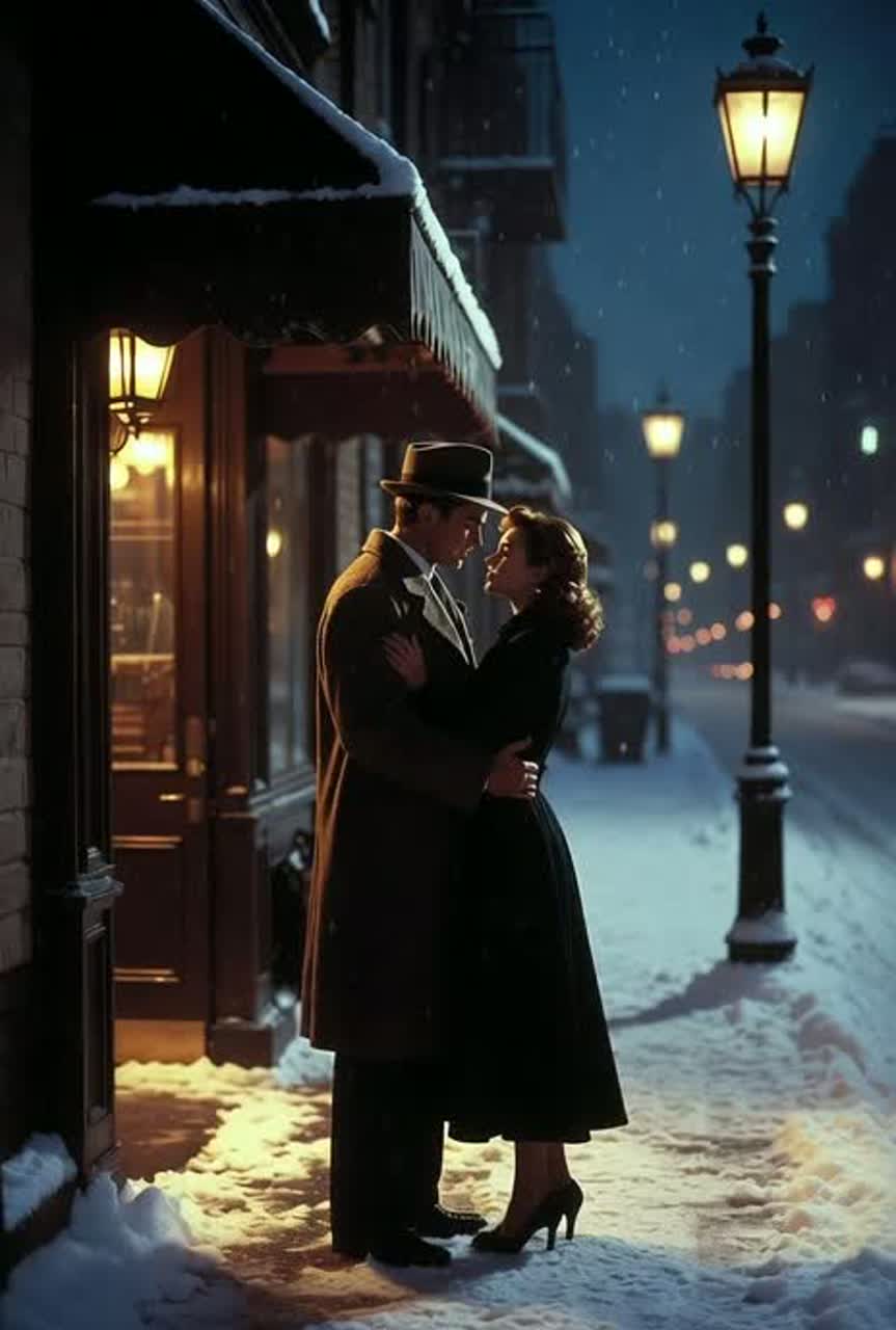 Create a warm, nostalgic Christmas jazz ballad inspired by American music of the 1940s–1950s, Slow–mid tempo, gentle swing feel, Use upright bass, brushed drums, soft piano chords, muted trumpet, light strings, and vintage warm-room reverb, The atmosphere should be cozy, slightly melancholic, romantic, like winter nights in an old city, Male lead vocal only — smooth, expressive, classic crooner style, with emotional phrasing and subtle vibrato, Avoid modern pop elements, The arrangement should feel timeless, intimate, and cinematic, as if from an old holiday movie