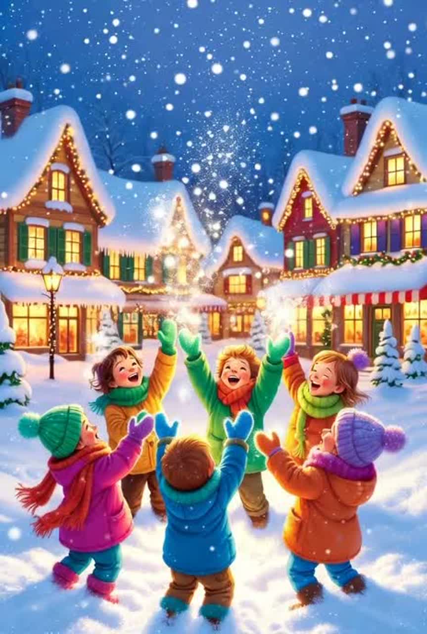 Energetic and uplifting winter song, first snow falling, December atmosphere, joyful and positive, sparkling snow, cozy streets and warm feelings, festive but modern and fresh, catchy melodies, playful and light lyrics, driving rhythm, not a traditional Christmas carol or cliché holiday pop, vibrant instrumentation, feel-good winter vibes