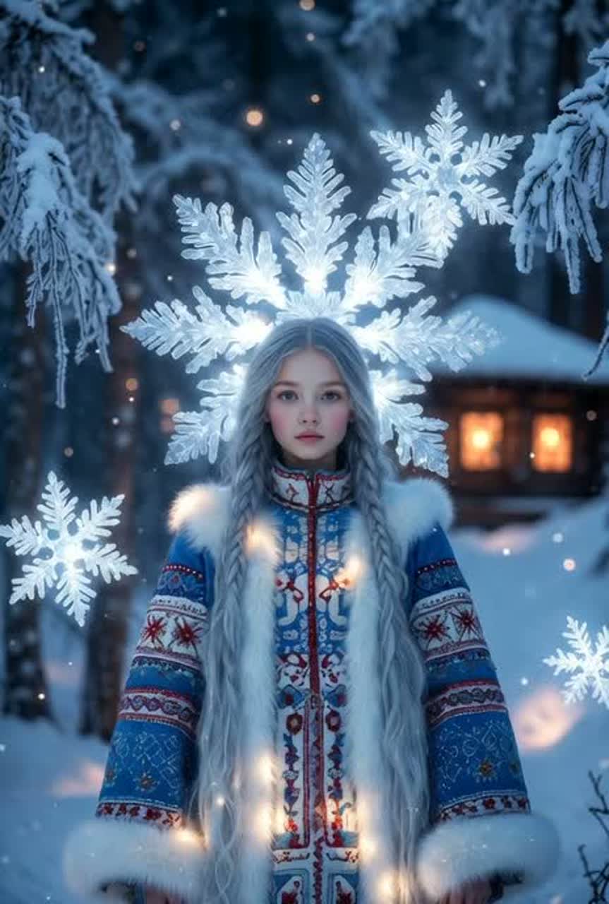 Create a Slavic, fairy-tale inspired Russian winter song with a magical folkloric soul, Use a soft, lyrical female vocal in Russian, warm but slightly mysterious, as if a snow spirit is telling an ancient story, Tempo slow to mid, gently flowing like falling snow, Instrumentation should blend delicate piano, glockenspiel and ice-like bells, soft strings, and traditional Slavic folk colors such as gusli or plucked folk harp, Add shimmering staccato sparkles that twinkle like snow crystals, Include subtle winter ambience — quiet wind, distant bells, snowy air, Layer faint ethereal choir and glowing pads underneath to suggest old spirits, legends and hidden magic, The mood should be light, beautiful and enchanted, with deep Slavic nostalgia and fairytale wonder
