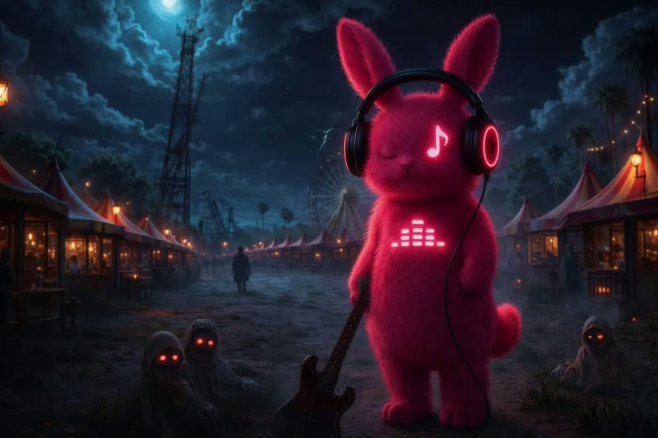 EDM, phonk, trap, candy coated synths, burple neon aura, woozy pads, distorted 808s, glitch sparkles, toybox percussion, carnival psychedelia
