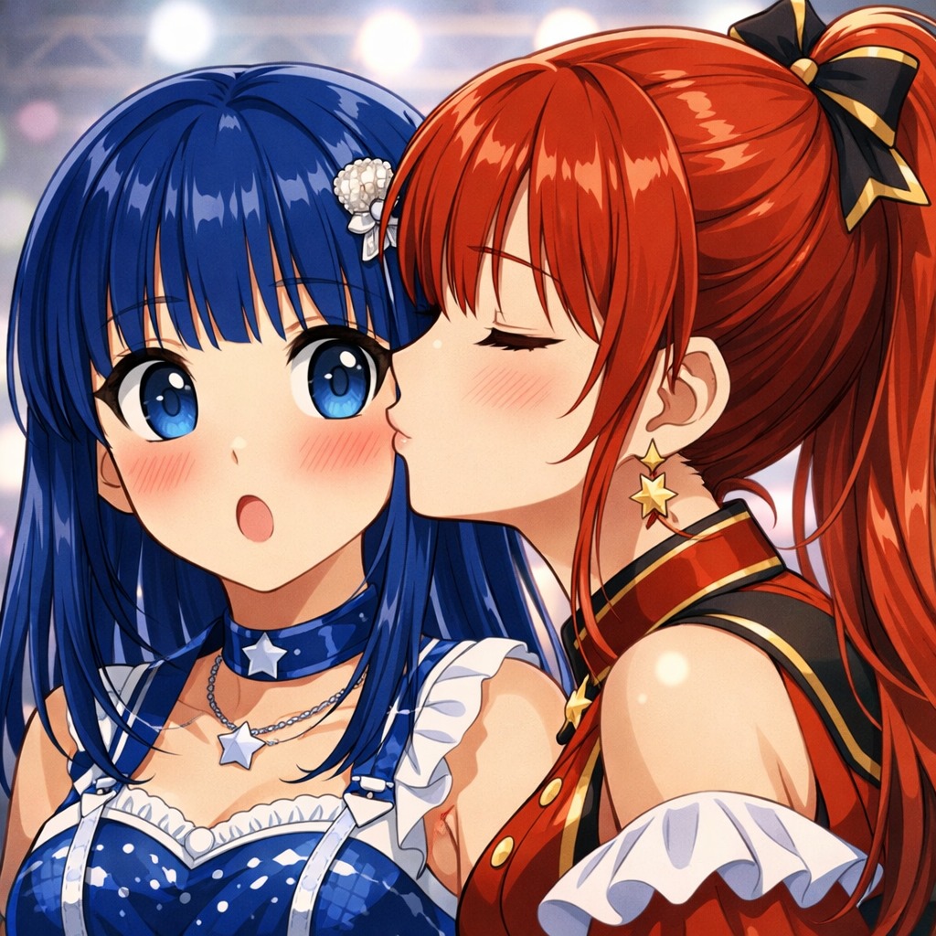 Japanese female idol group pop, high energy live concert song, 142 BPM, bright and uplifting major key, cute and powerful layered female vocals, catchy hook, call and response, claps, audience chant, sparkling synth, punchy bass, energetic drums, sweet and slightly emotional, explosive final chorus, festival vibe