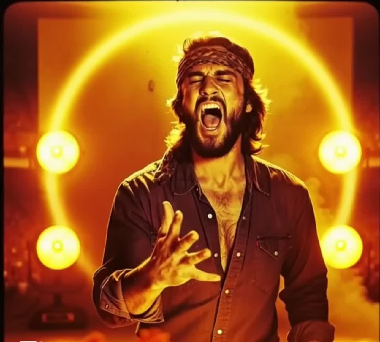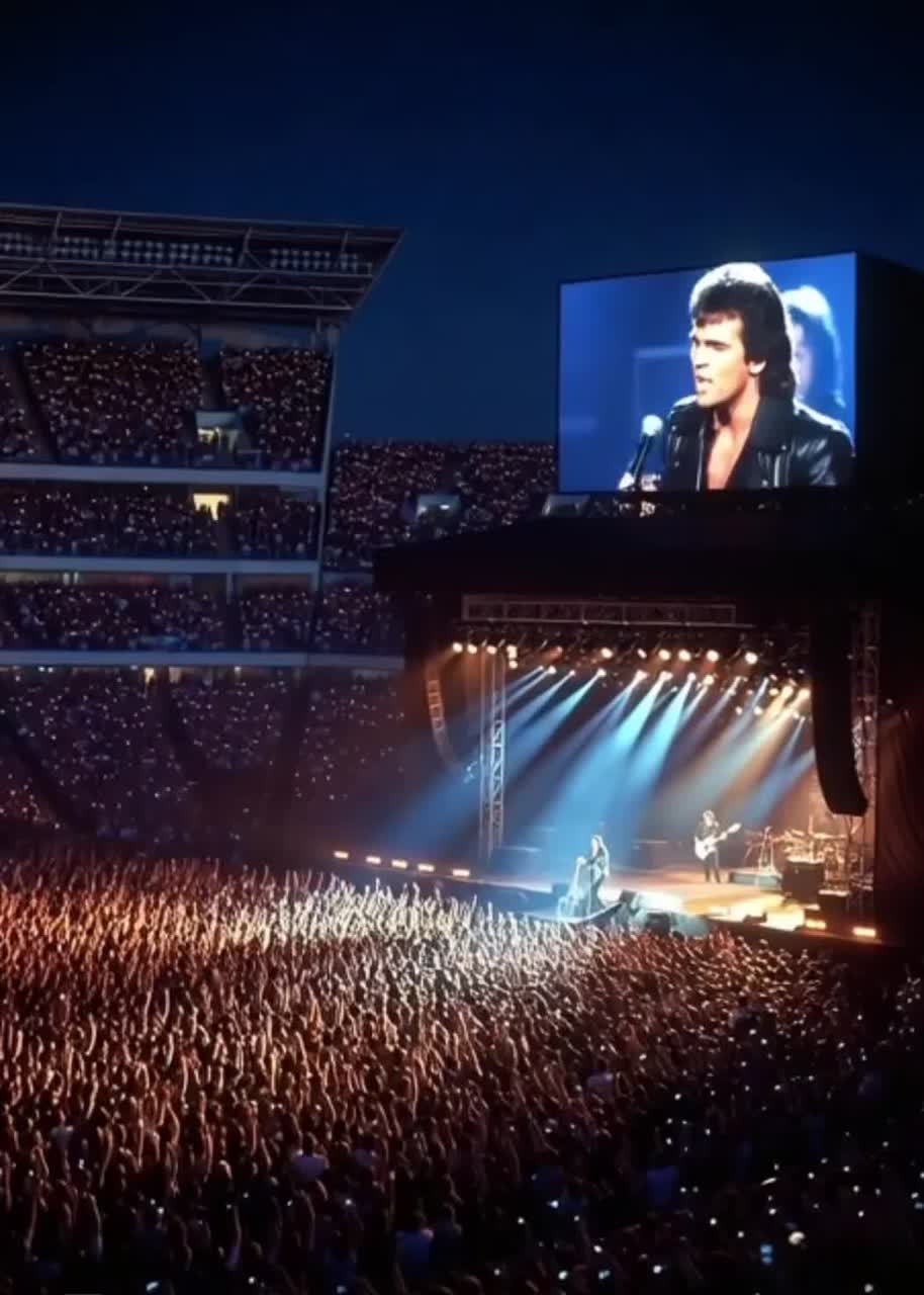 Clip Volume +4, Arena rock 1977 Wembley live feel: big dry kick + snare cannon, wide toms, loud handclaps, real stadium crowd bed (chants, cheers, singalong), analog tape warmth, slight wow/flutter, Crunchy rhythm guitars L/R, biting lead guitar fills, singing sustain solos, punchy bass locked to kick, Grand piano stabs for drama, occasional Hammond organ swells, Male lead vocal: bold, forward, classic rock phrasing, big vibrato on long notes, confident hooks, crowd-call moments, Structure: Verse 1 → Pre-Chorus → Chorus (crowd singalong) → Verse 2 → Pre-Chorus → Chorus → instrumental break (guitar solo) → Bridge (half-time stomp) → final Chorus x2 with crowd, Start immediately with lead vocal line — no intro, no ambient buildup, no soft vocalizations, Mix: loud guitars, snare upfront, crowd audible, huge plate reverb on vocal, short slapback delay, master slightly driven like a live board mix, Weird 50 / Style 95
