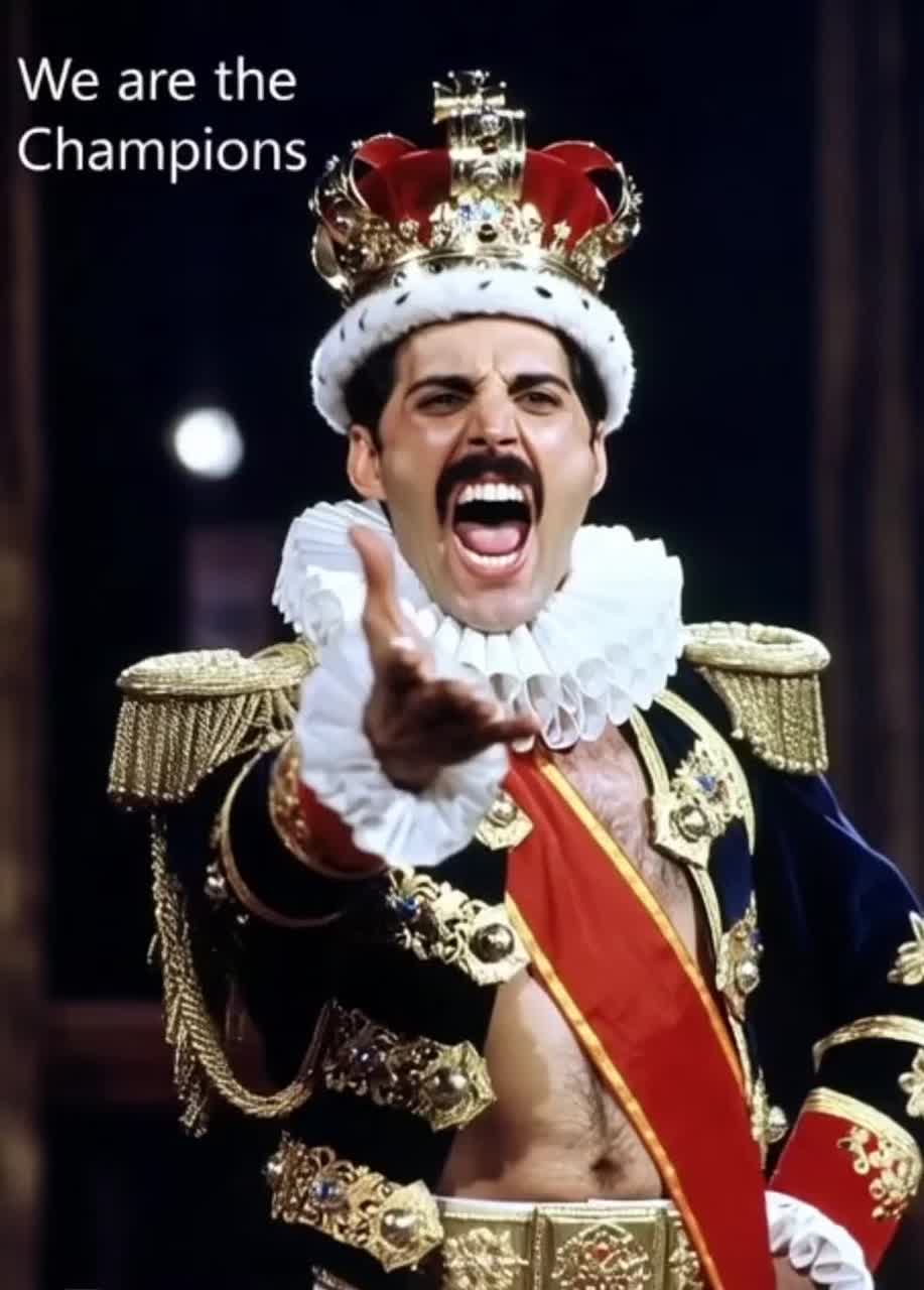 Classic 1970s arena rock cover in a Queen-like style (do not name the band), Live Wembley Stadium 1977 atmosphere, Powerful theatrical male lead vocal, wide range, dramatic phrasing, long sustained notes, commanding stage presence, Big open guitar riffs, melodic lead guitar, rich harmony vocals in the chorus, driving bass, thunderous live drums, Tempo ~150 BPM, key F minor, Massive crowd participation, call-and-response chants, hand claps and stomps, Analog warmth, raw live energy, no modern pop polish, Start immediately with lead vocal line — no intro, no ambient buildup, no vocalizations, Clip Volume: Lead +4, Guitars +3, Drums +3, Bass +2, Crowd +2, FX +1, Master -1, Weird 50 / Style 95