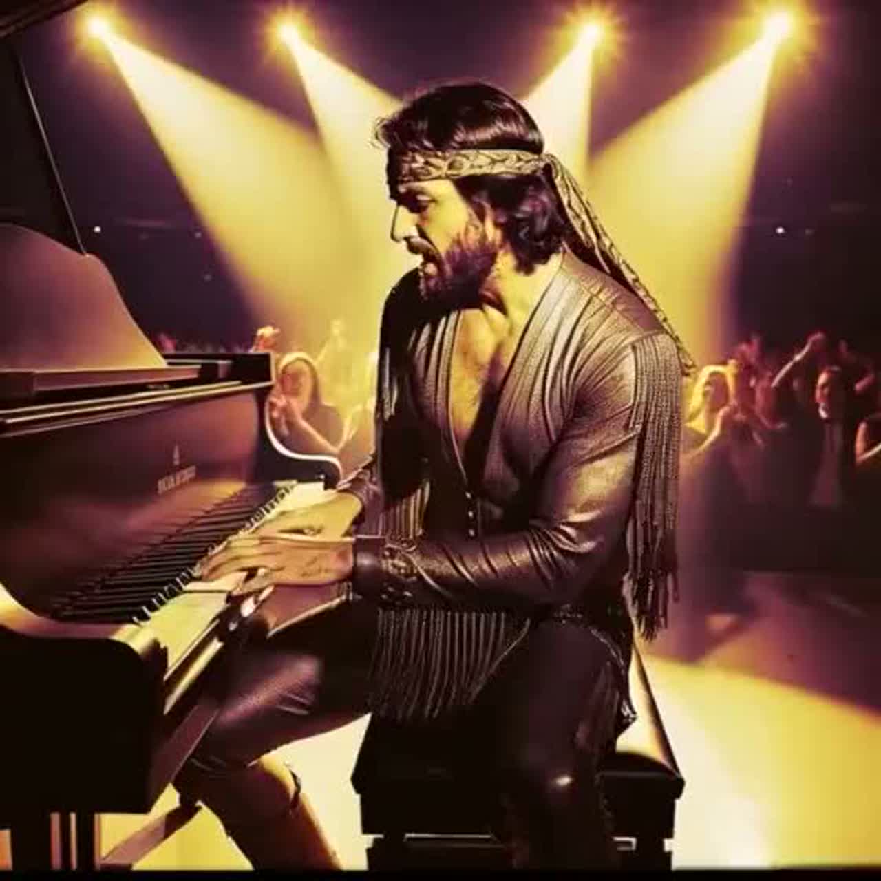 Arena rock ballad in the style of 1977 Wembley concerts, with grand stadium acoustics, dramatic guitar harmonies (Brian May-like), emotionally charged male vocal (tenor), lush vocal layering, analog vintage reverb, Emphasize build-up from soft piano + ambient pads to powerful guitar solo with choir-style crowd chants, Include sweeping strings, stadium claps, and echoic arena snare, End with extended outro led by crowd voices fading into reverb, Clip Volume +4