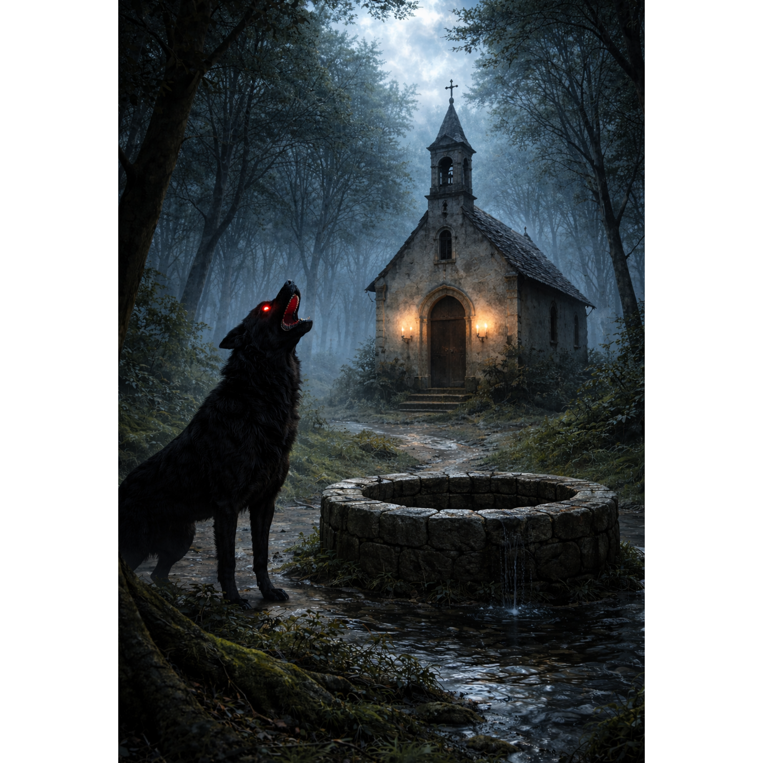 A dark folk rock style with subtle medieval influences fits this song best, as it supports storytelling and creates an eerie, atmospheric mood, The tempo should be slow to mid-paced, Acoustic guitar or hurdy-gurdy can form the foundation, with a muted violin adding tension and melancholy, A deep, steady bass line or frame drum can mirror the heavy, watchful presence of the black dog, In the chorus, restrained backing vocals or choral layers can give the impression of voices rising from the forest, Minor keys and symphonic arrangements help keep the mood serious and believable, while a low, calm, narrative vocal delivery makes the story feel like an old legend being passed down, Cinematic
