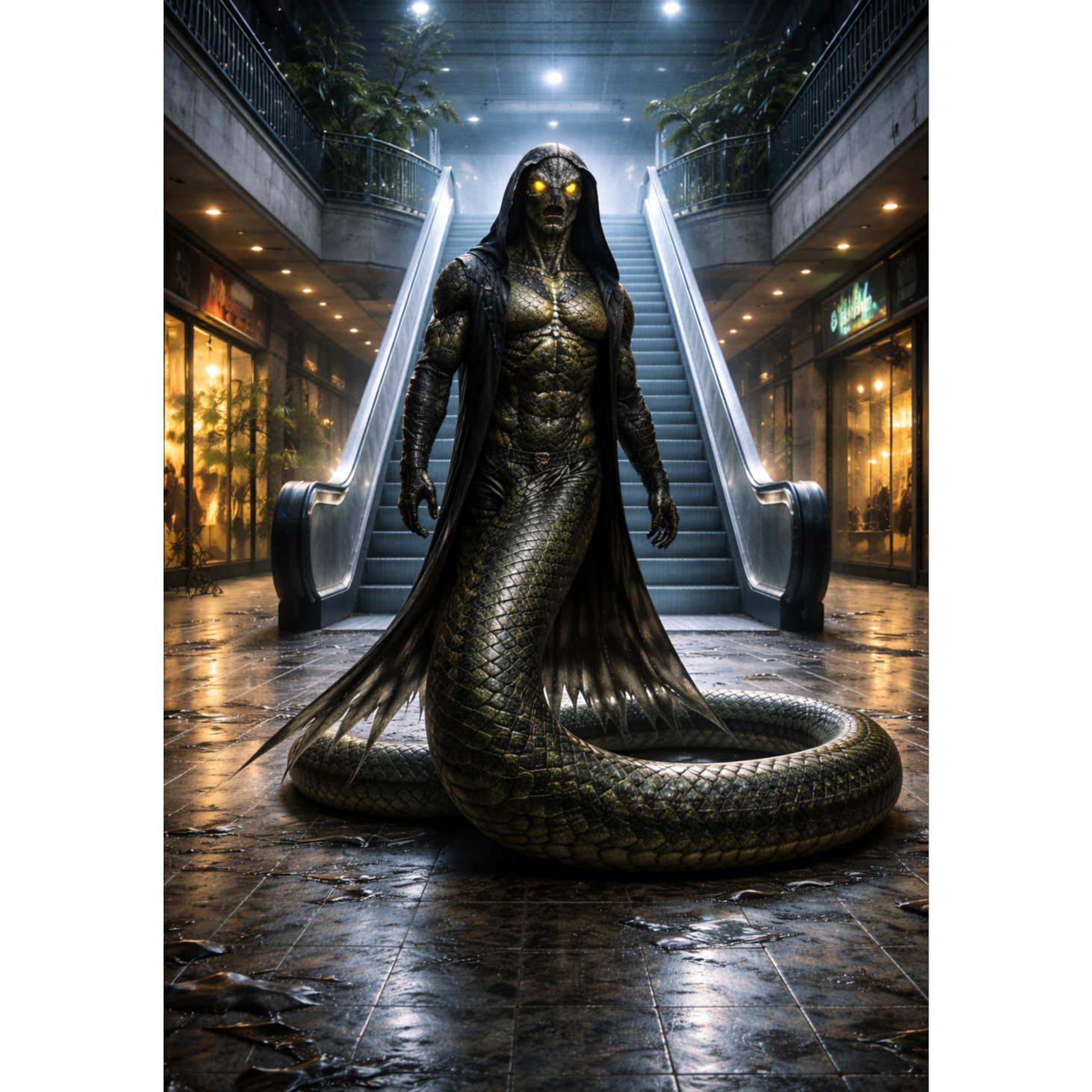 Eerie, and intense music, blending atmospheric symphonic black metal with blast beats, tremolo-picked riffs, and sweeping orchestral layers, Synthwave basslines and dark synth-pop textures add a cold, neon-lit undercurrent that contrasts with the raw metal aggression, Filipino elements like kulintang-inspired percussion, bamboo flute motifs, and harana-style melodic echoes anchor the legend in its cultural origin, The verses are tense and mystical, driven by pulsating synths and spoken-sung vocals that unfold the story of the Snake-Man, The chorus erupts into epic, multi-part choral voices, soaring melodies, and layered synths, making the hook “Snake-Man…” feel both ancient and futuristic, Dramatic scenes, such as the trapdoors, intensify through orchestral swells, reverb-heavy synths, and black metal fury, In the end, choirs, synth pads, and traditional echoes fade together, leaving an unholy, haunted atmosphere behind
