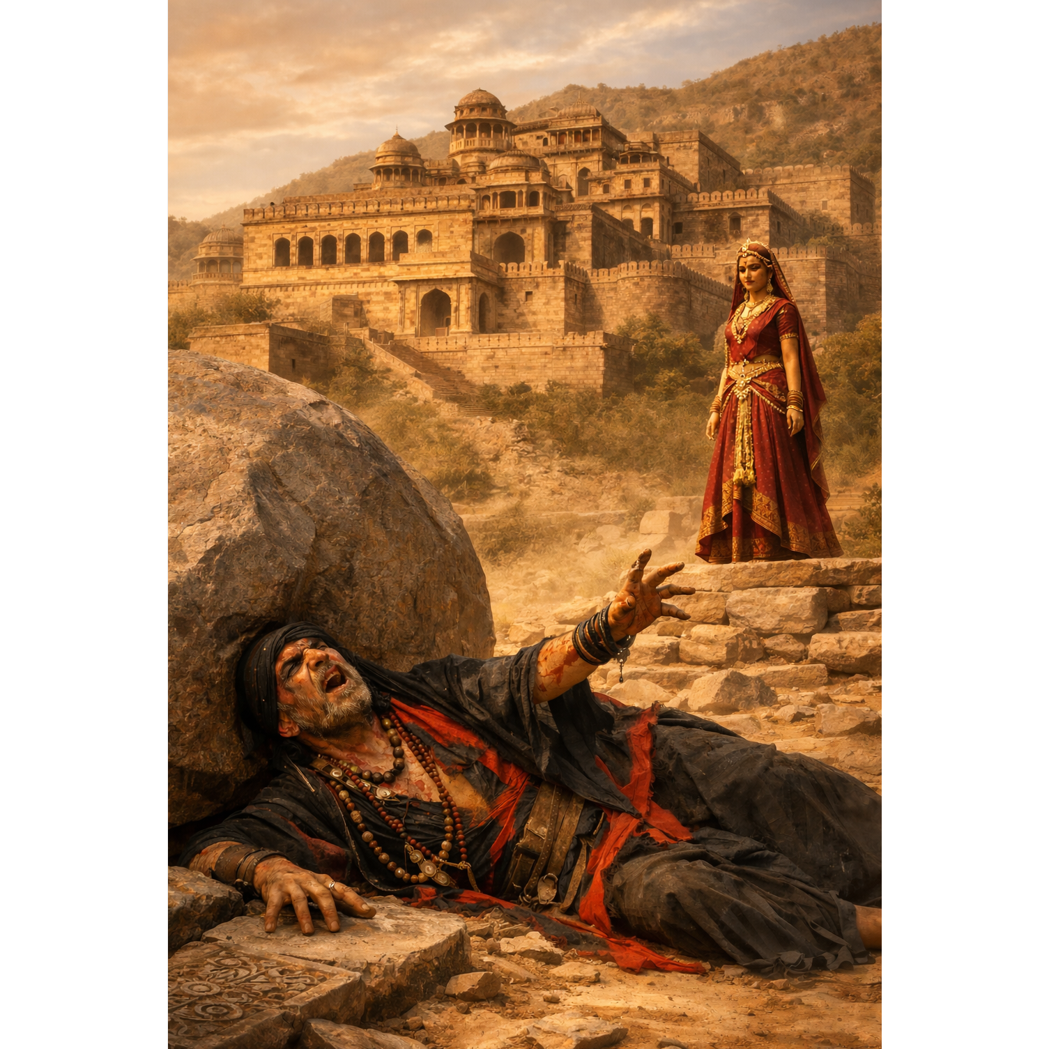 atmospheric symphonic metal, opera, choir, dark and mystic, mysterious, Gothic Rock, epic, cinematic, dark, epic mood and a medium to fast tempo, Down-tuned electric guitars deliver heavy, melodic minor-key riffs inspired by North Indian scales, creating an exotic tension, The drums combine powerful metal grooves with polyrhythmic accents influenced by traditional Indian tala structures, A sarangi and sitar theme opens the song and returns between verses and chorus as a haunting leitmotif, Additional tabla and dhol blend with the metal percussion, giving the rhythm a ritualistic, driving pulse, The vocals are clean and powerful, shifting between dark, storytelling verses and a grand, anthemic chorus, Atmospheric drones, temple bells, and subtle choir layers add a mystical texture, Intro: mysterious sitar and sarangi sound
